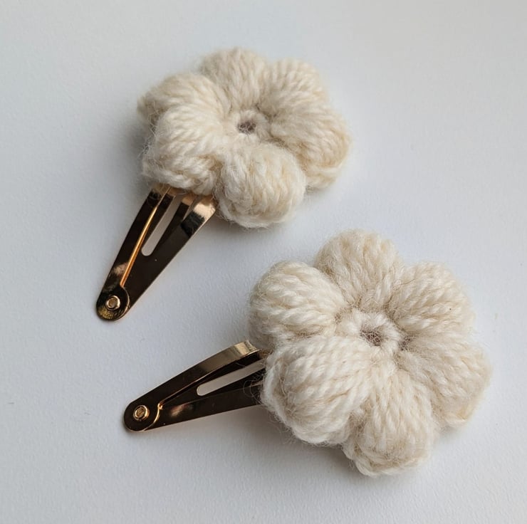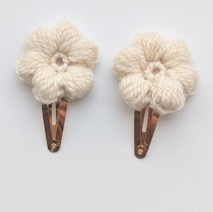 Hand crocheted flowers using cream yarn and attached to gold hair clips. Suitable for flower girls or young bridesmaids or christenings.