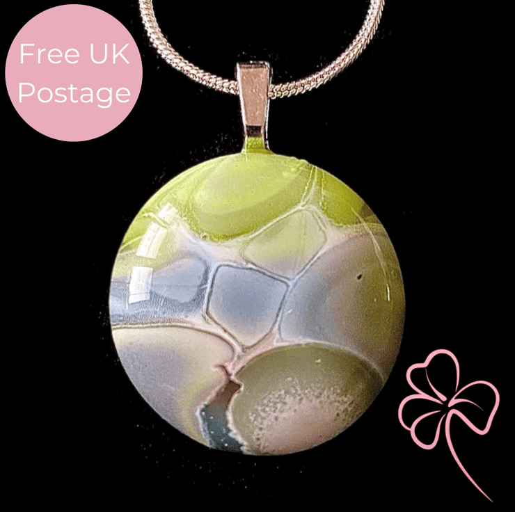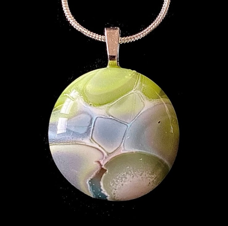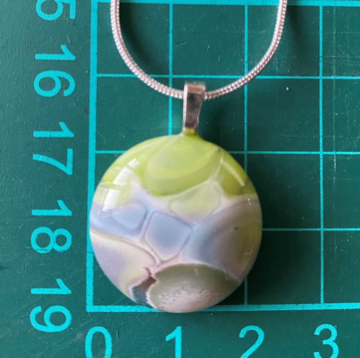 This unique pendant was made by fusing coloured glass and paint in layers multiple times at 870 degrees Celsius. The technique was developed by Liz Roets. A jewellery bail was glued to allow it to hang on a 18” silver plated chain.