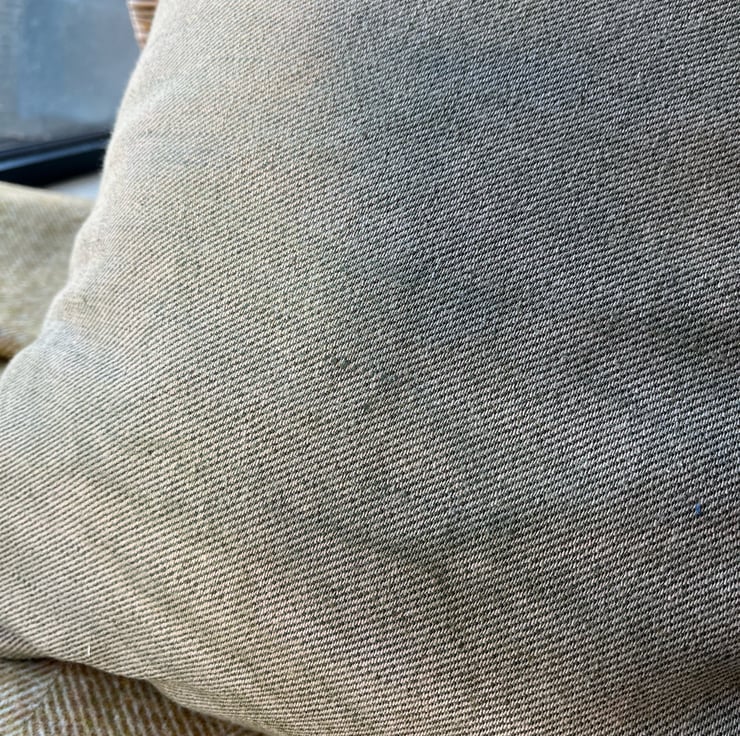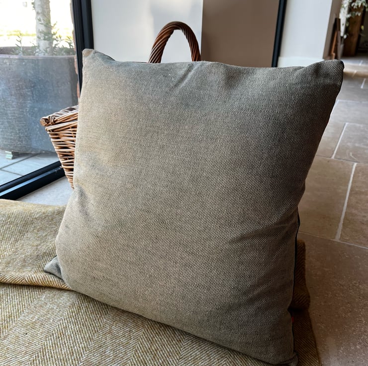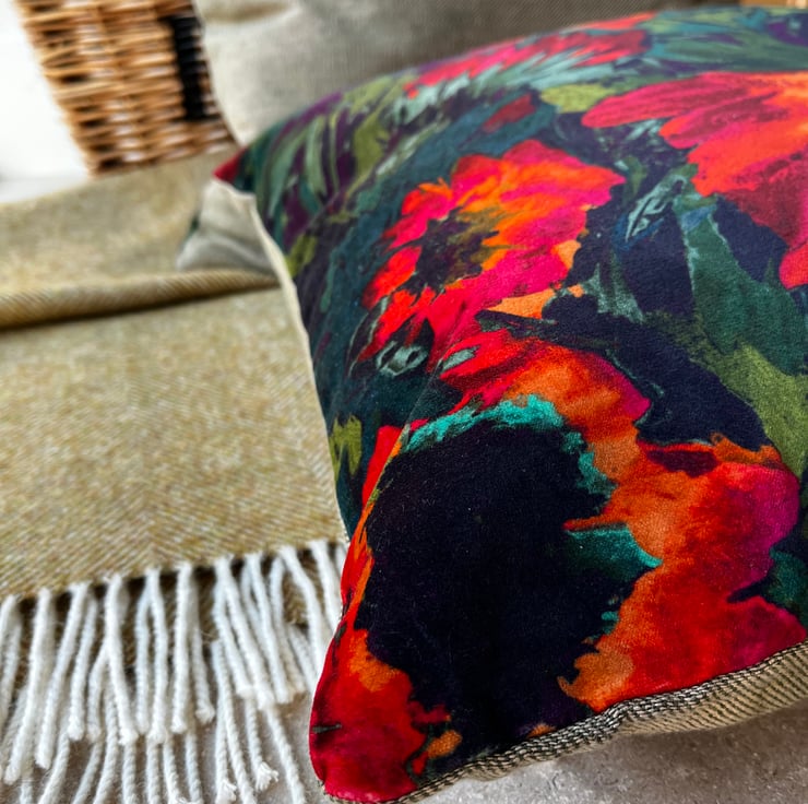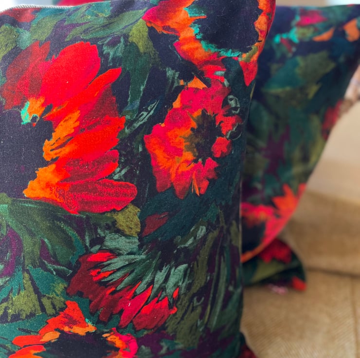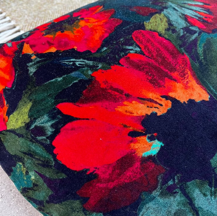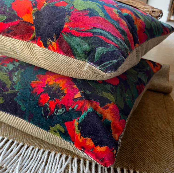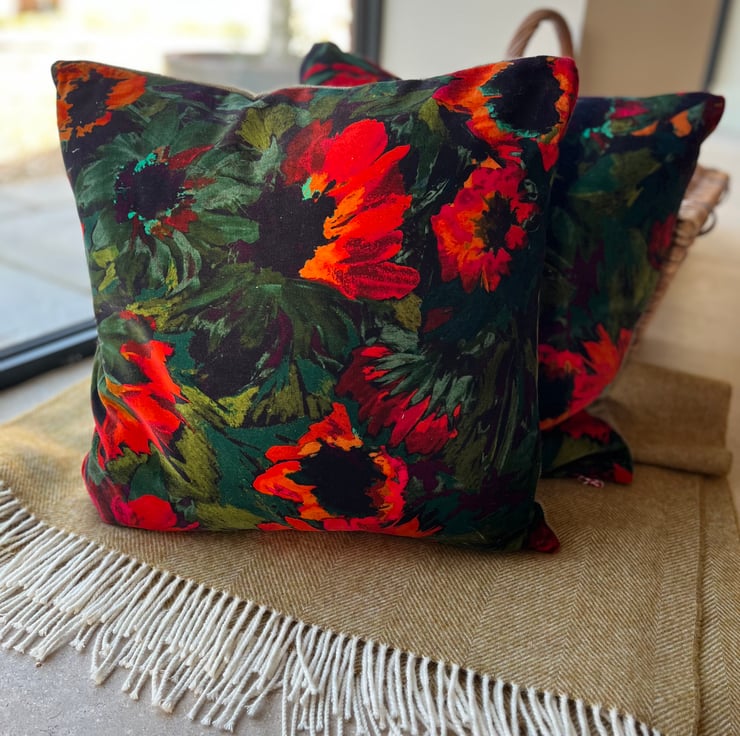 Luxurious large velvet cushion cover with red and green sunflower design. This beautiful cotton velvet is Harlequin Helianthus. I have backed the cover with reclaimed khaki twill from curtains. It has a slightly mottled appearance.