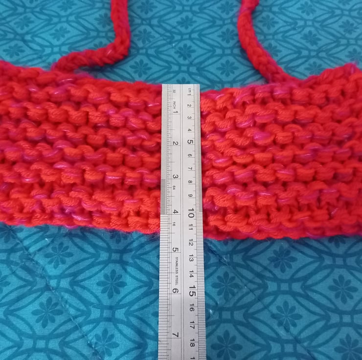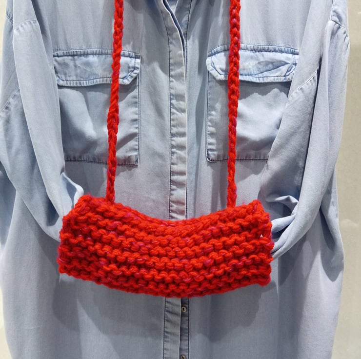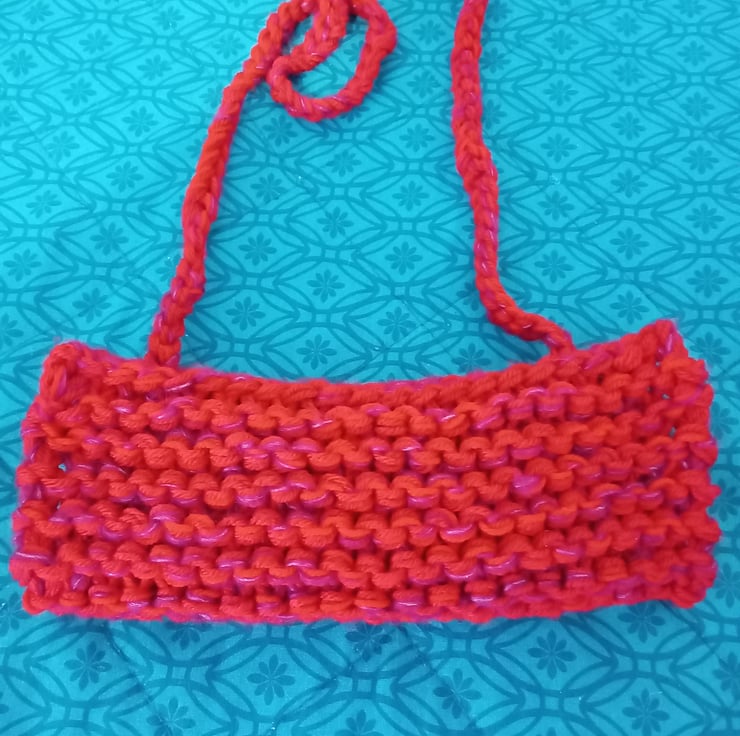 This one is in a mix of bright reds and a strand of burgundy fluffy angora mix yarn. The colour is darker than shows on the pictures and the burgundy looks pink!