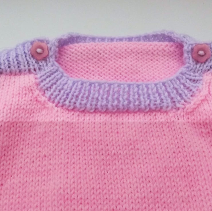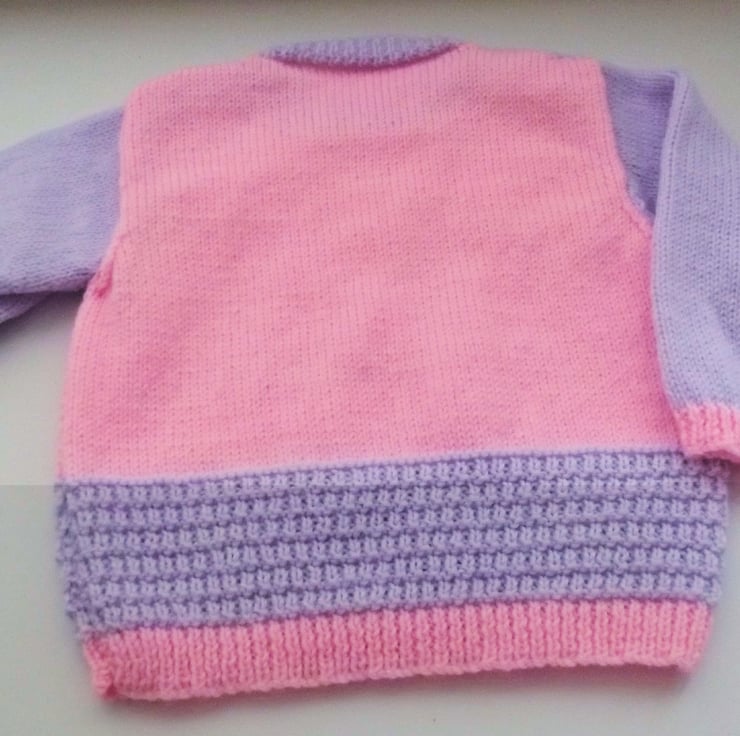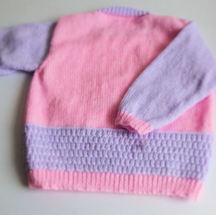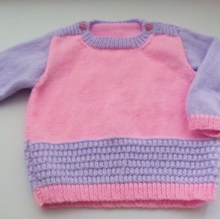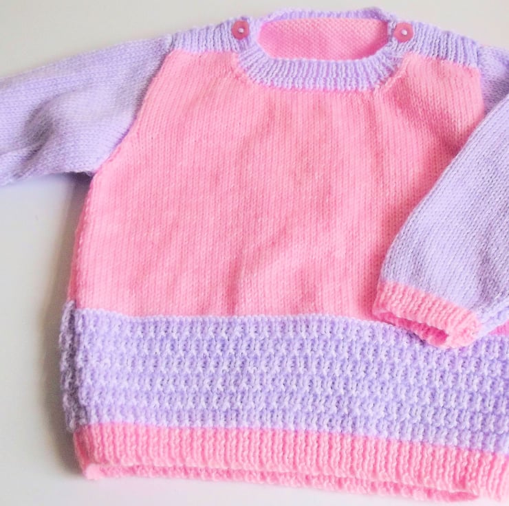 Hand knitted by me. Lilac and Pink Jumper. Round neck with shoulder fastenings. Knitted in fine weight acrylic blend yarn. hm133