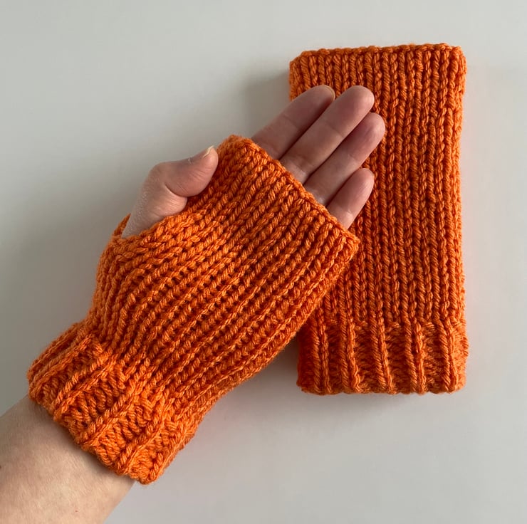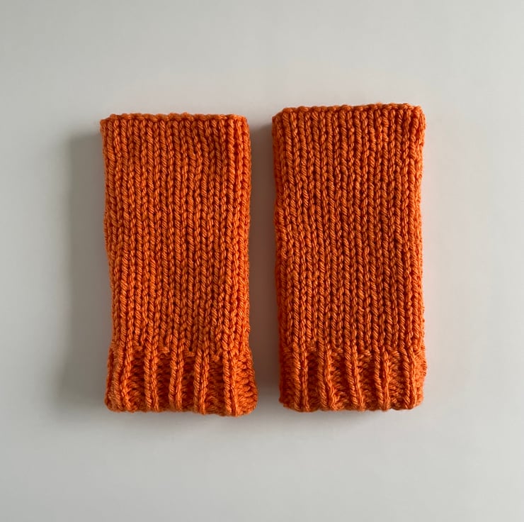 These orange coloured fingerless gloves are double layered, so they will keep your hands warm and cosy. When you need to use your hands, simply place your thumb inside, pull them further down your arm and wear them as wrist warmers.