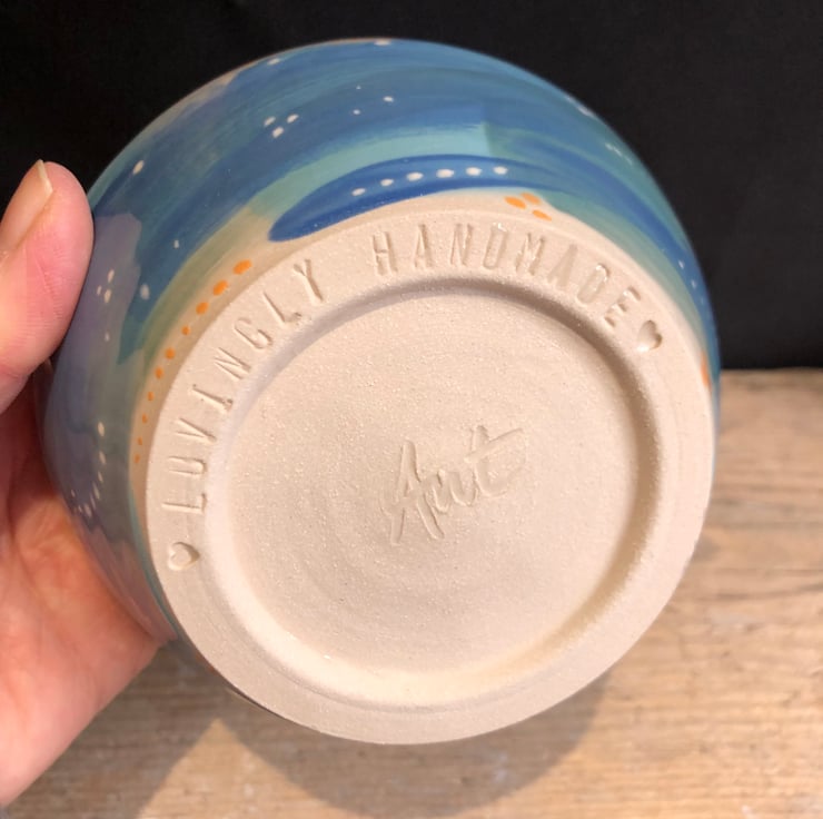 A lovingly handmade stoneware bowl which has been thrown on the potter’s wheel using white stoneware clay and decorated with coloured slips before being bisque fired (the first firing). Then dipped in a glossy transparent glaze and fired for a second time.