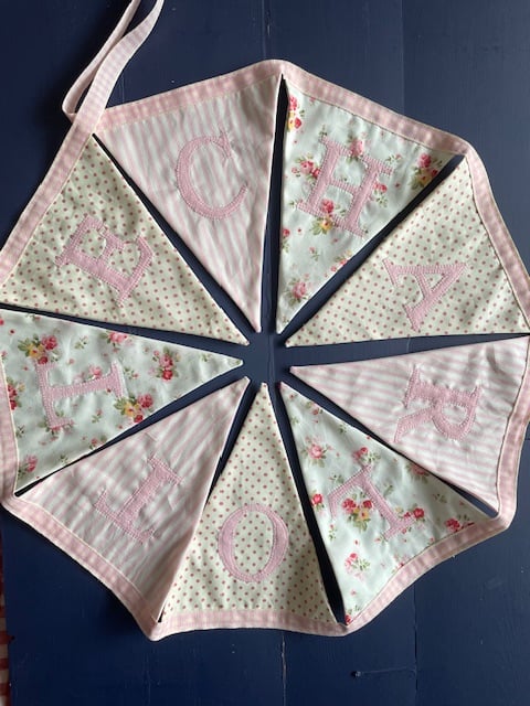 Personalised bunting in shades of pale pink and cream with the name Charlotte sewn in pale pink felt. The bunting has been made from a selection of floral, ticking stripe and polka dot fabrics which have been stitched onto vintage-style pink and cream gingham ribbon.