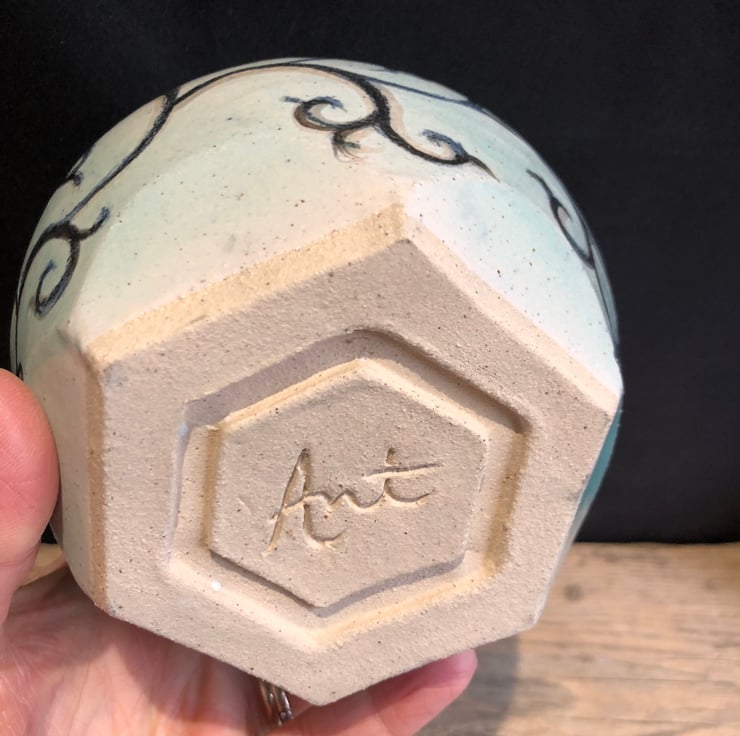 The swirling foliage design around the bowl has been painted freehand using black and grey underglazes and then dipped in a glossy translucent turquoise glaze before firing for a second time.