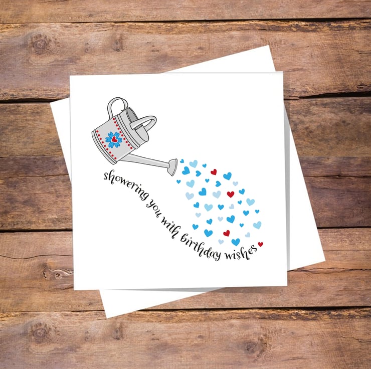Perfect card to say Happy Birthday. Simple, modern colourful design. With 3 red shimmer hearts and 5 shimmer blue hearts.