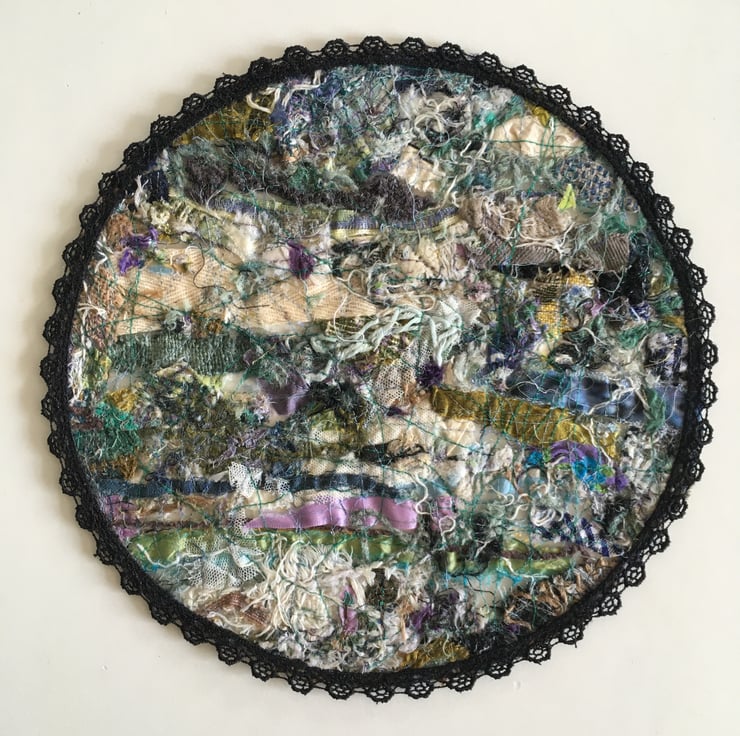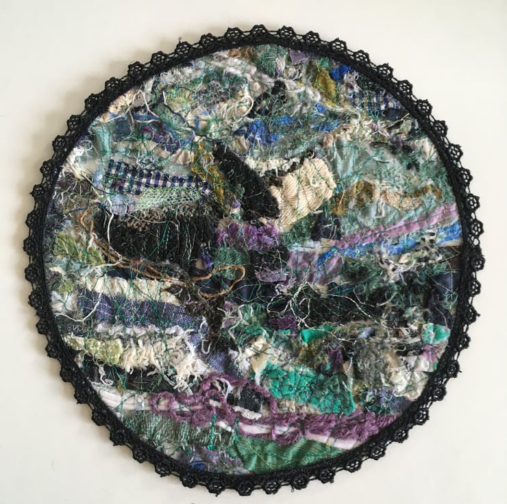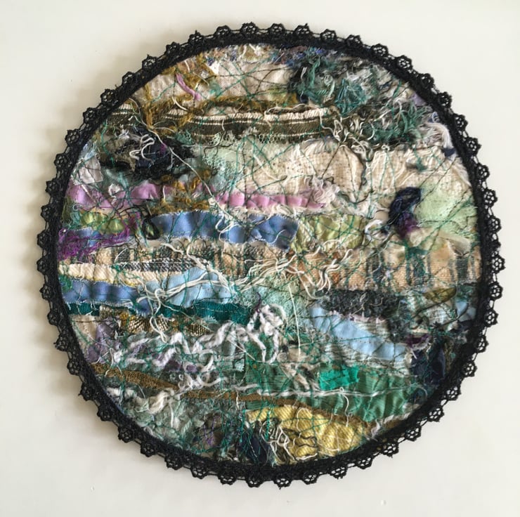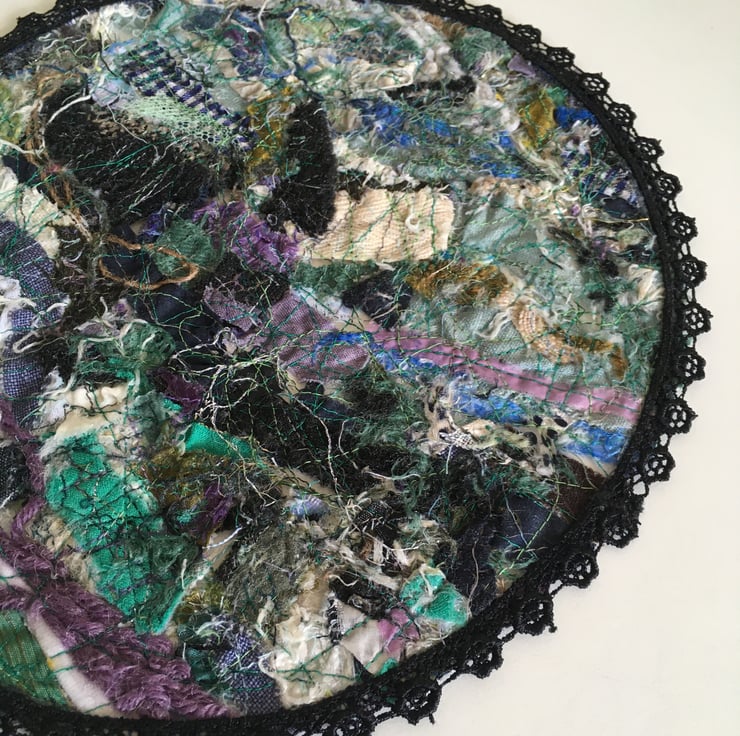 Placemats made entirely out of fabric waste. Stitched together using dissolvable fabric, starched to make stiff and trimmed with black lace. Each placemat is completely unique!