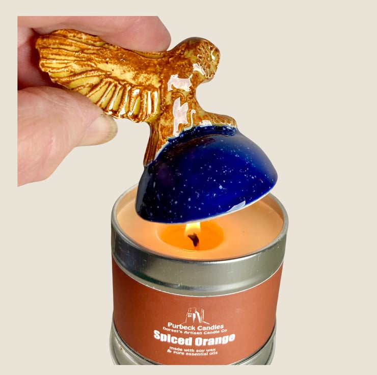 Handmade ceramic candle snuffer, created using my own original moulds then hand finished and glazed to make each one unique. This owl has a burnt sugar glaze with moonlit blue base.