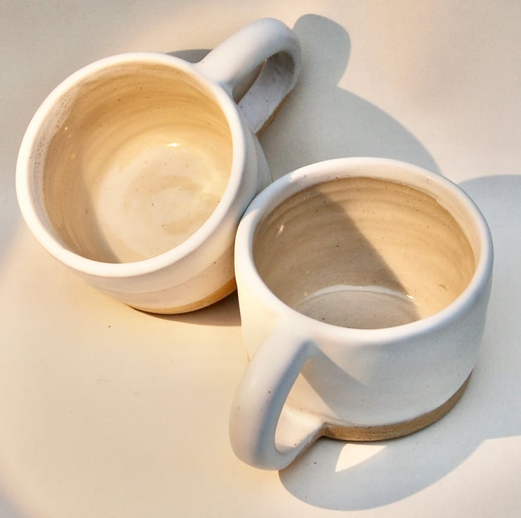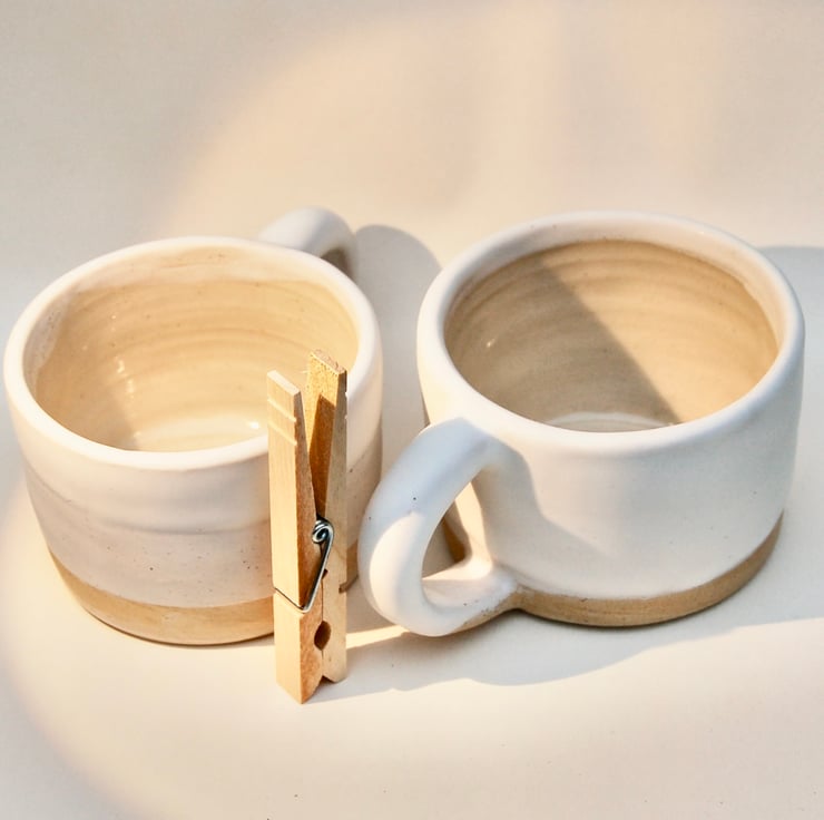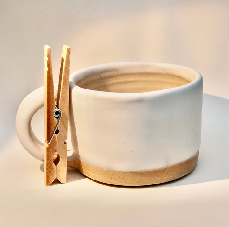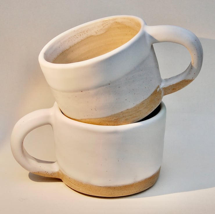 120 ml capacity mug in white stoneware with glazes softly overlapping for a pretty natural effect. Exterior glaze is a matt snowy white and the interior is a transparent liner glaze.The mugs are dishwasher safe but have a homespun appearance.