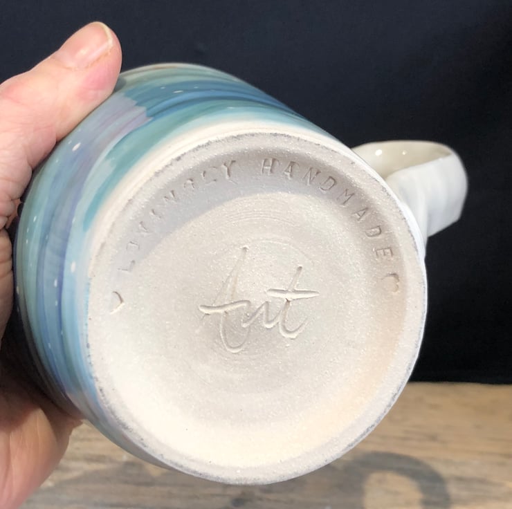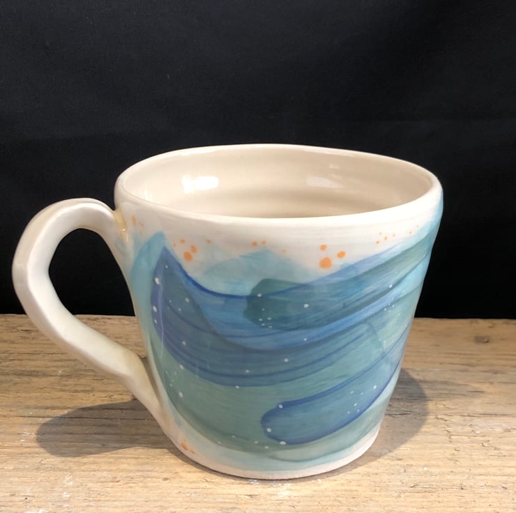 A lovingly handmade thrown mug made from white stoneware clay and decorated with coloured slips before being bisque fired (the first firing). Then dipped in a glossy transparent glaze and fired for a second time.