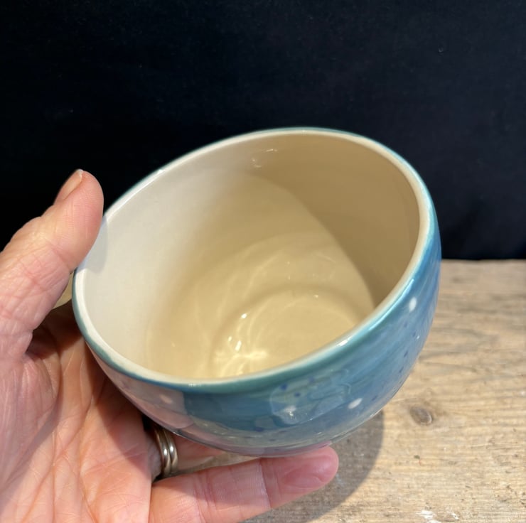 A lovingly handmade thrown stoneware bowl made from white stoneware clay and decorated with coloured slips (liquid clay with pigment) before being bisque fired (the first firing). Then dipped in a glossy transparent glaze and fired for a second time.