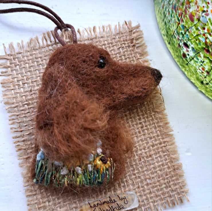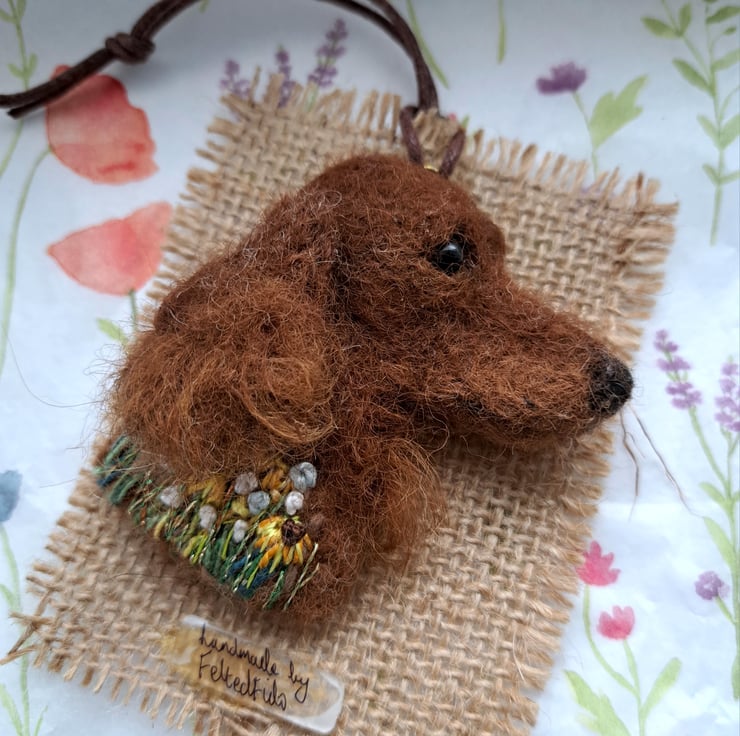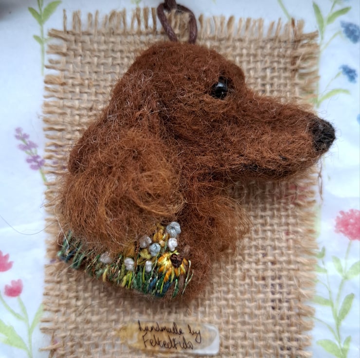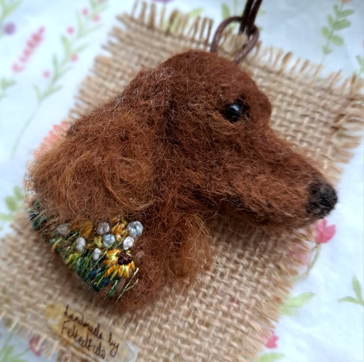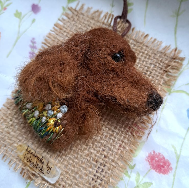 needle felted irish setter brooch,with embroidered details,approx 3 inches,metal brooch fitting to rear.