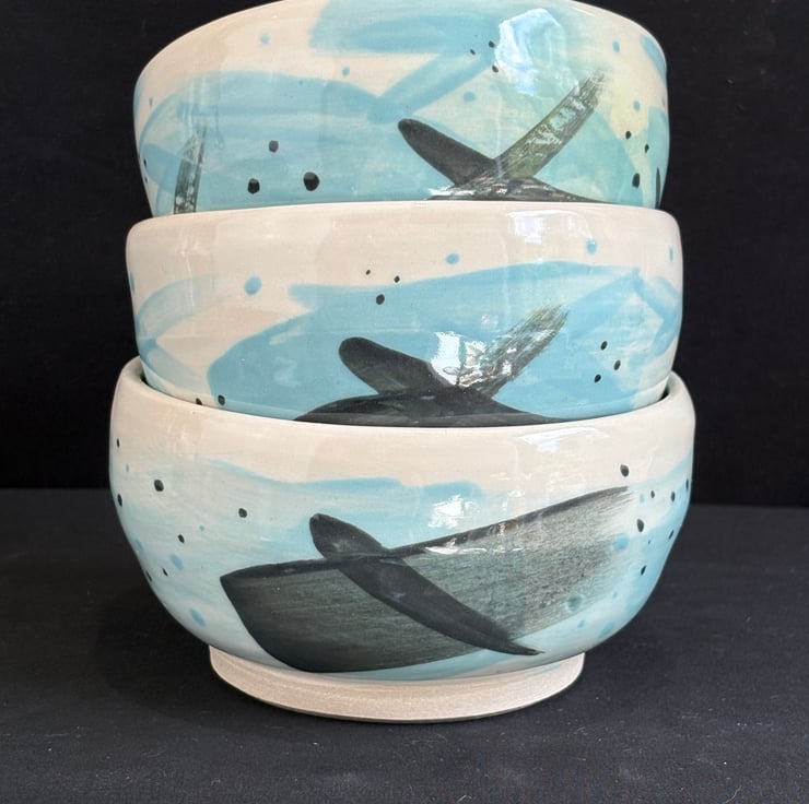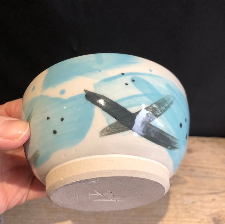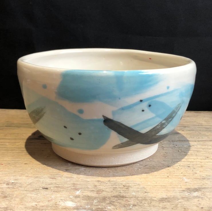 A lovingly handmade thrown stoneware bowl made from white stoneware clay and decorated with coloured slips (liquid clay with pigment) before being bisque fired (the first firing). Then dipped in a glossy transparent glaze and fired for a second time.