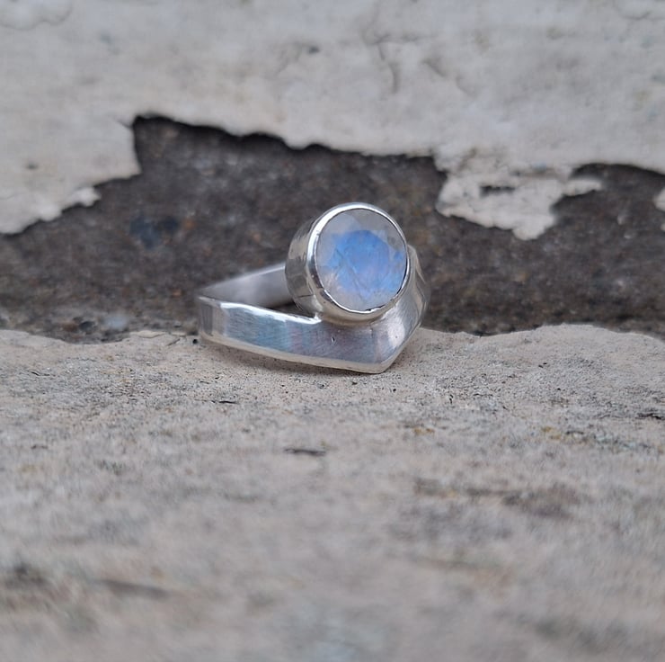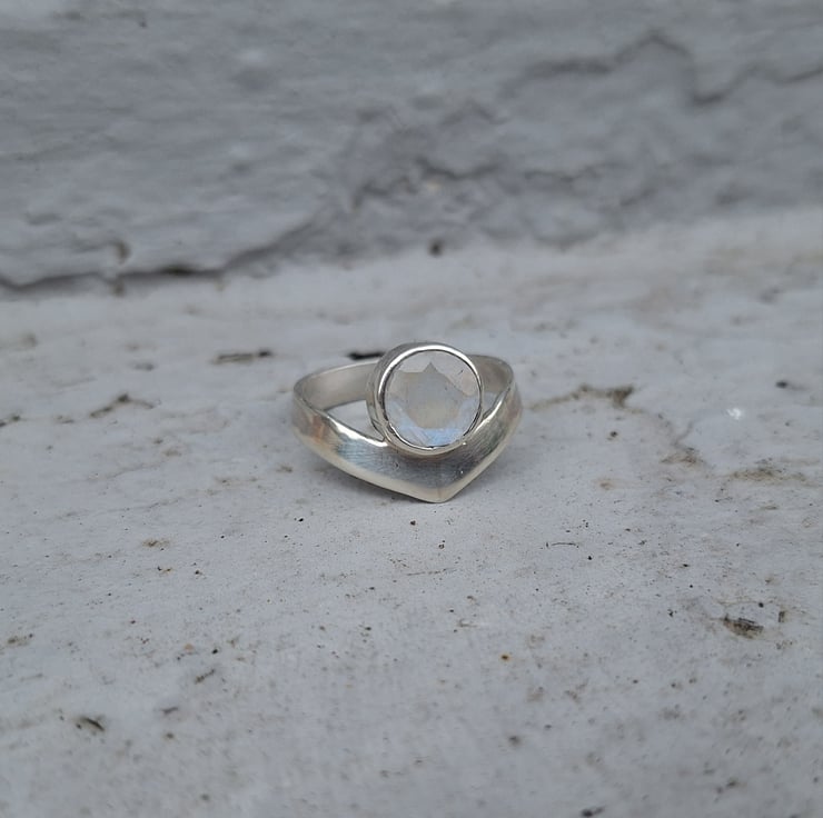 This faceted moonstone has such a beautiful blue flash and shimmer to it. The stone is set in a thick bezel, set into the inner point of a chevron, or wishbone ring. Its a relatively wide band and the large stone means it's a chunky statement piece, without being too bulky. The ring is made of recycled sterling silver with a polished finish.