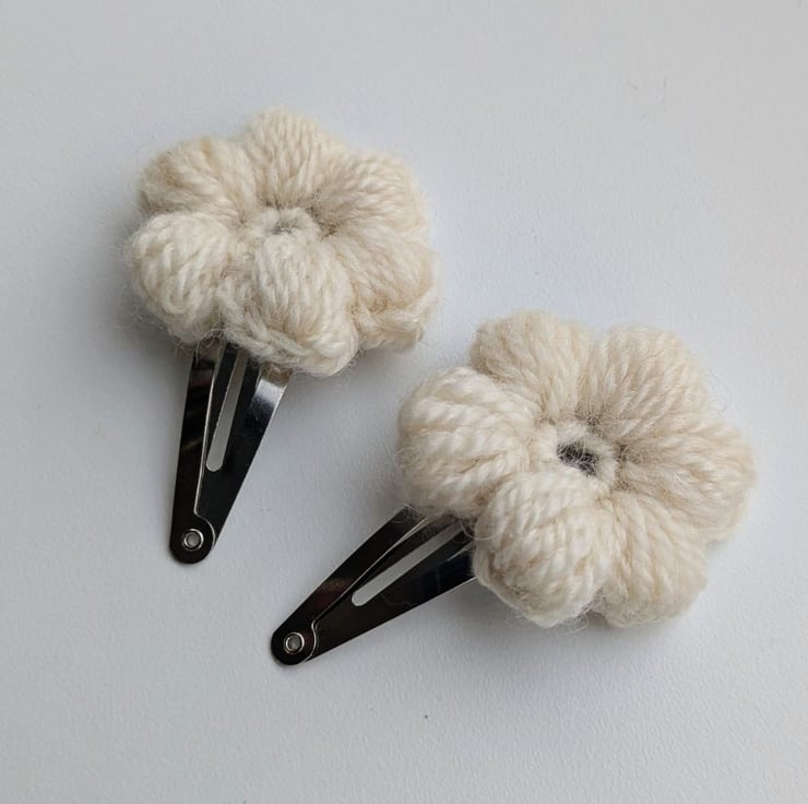 Hand crocheted flowers using cream yarn and attached to silver hair clips. Suitable for flower girls or young bridesmaids or christenings.
