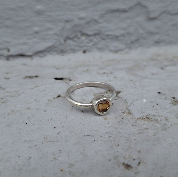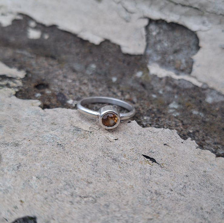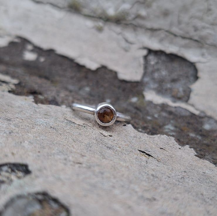 The ring is made of completely recycled sterling silver. The band itself is a 2.3mm wide D shaped or half round profile. The stone is set into a thick walled bezel setting.