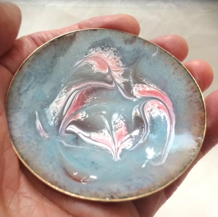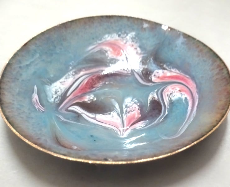 This is a copper bowl I have decorated with glass enamel. It measures 74mm in diameter, 20mm deep. The enamel has been built up in thin layers of powder each fired to red hot.