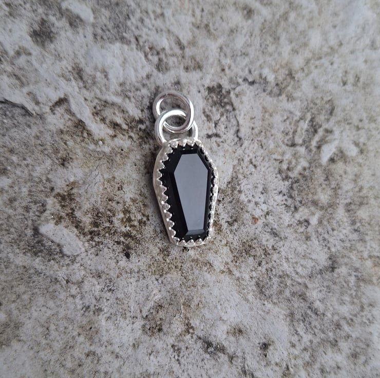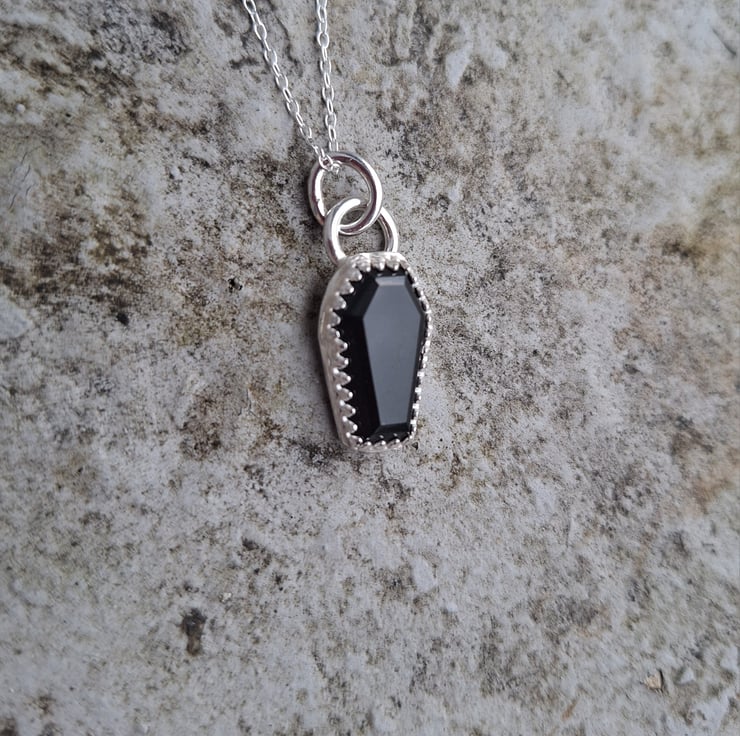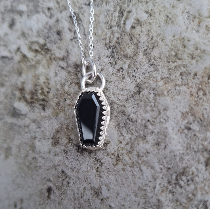 This is a beautiful step cut cabochon black onyx cut into the shape of a coffin. It’s set into recycled 925 sterling silver with beaded gallery wire and an open back.