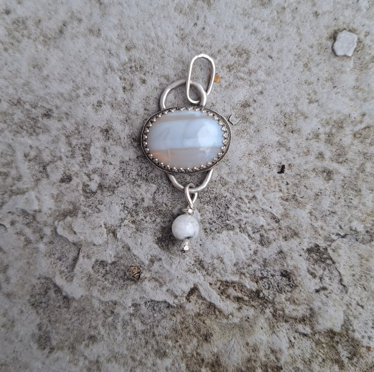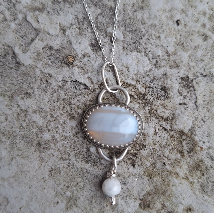 This lace agate has some lovely pale striping to it and a gorgeous light blue colour. It's "east west" set in a gallery wire bezel in recycled sterling silver. From the bottom of the pendant is hanging a beautiful faceted moonstone bead with tourmaline inclusions. Its got some lovely movement to it.