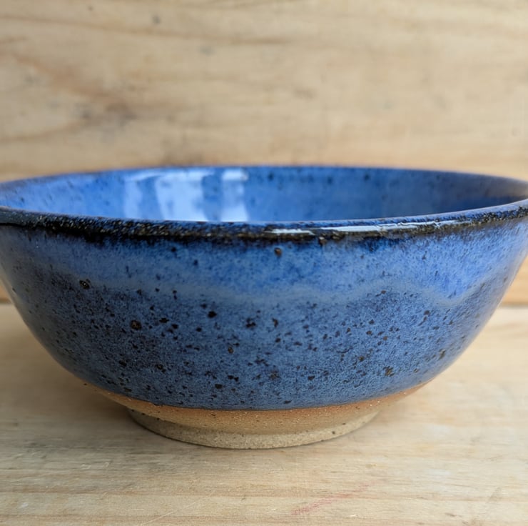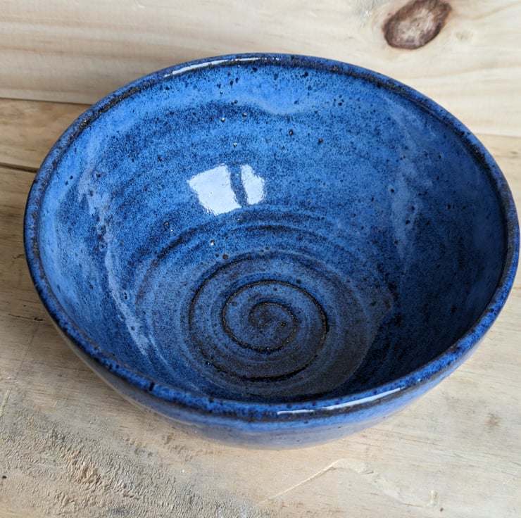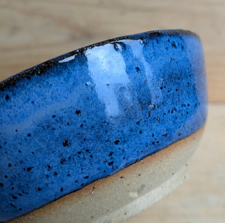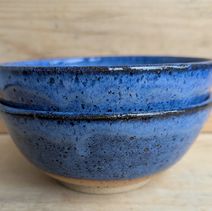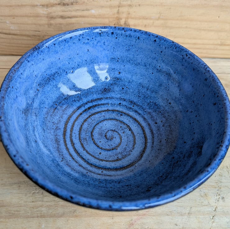 These are the perfect size for movie night nibbles, olives, antipasti or whatever you fancy!! I've used a textured speckled clay and left the bottom edge of the clay exposed on the outside so that you can feel it. Love this blue and the way it floats down from the edge & each one comes out of the kiln a bit different. The glaze also breaks over a swirl on the base inside. Price shown is per bowl; if you wish to buy both of these, please put two in your basket. Fired in a kiln at a stoneware temperature (c1200 degrees) which makes them more durable.