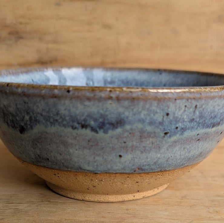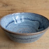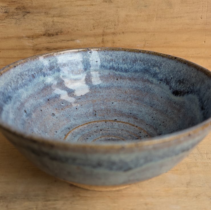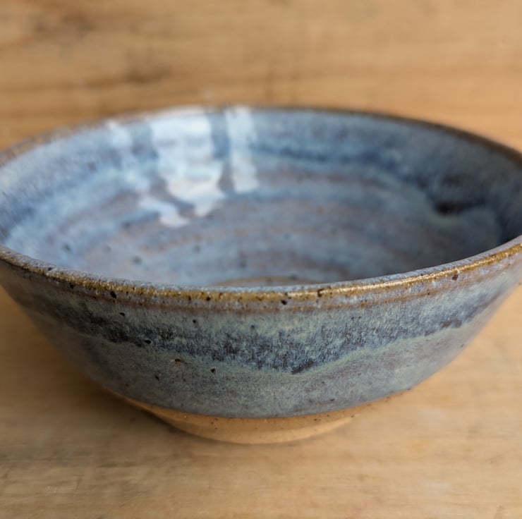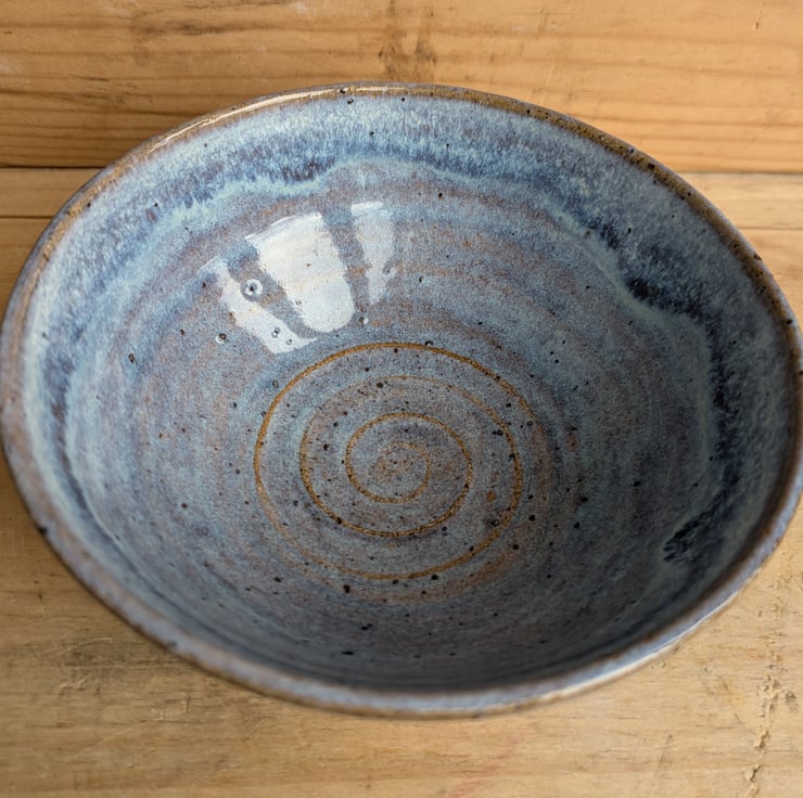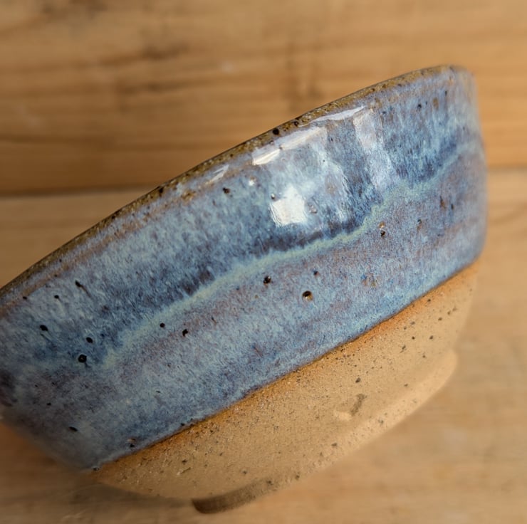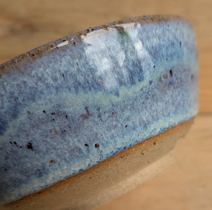 This is a new combination of glaze for me and this has one layer less glaze to the similar nibble bowl so it comes out slightly more transparent. I love the way the blues float down from the edge. This is the perfect size for movie night nibbles, olives, antipasti or whatever you fancy!! I've used a textured speckled clay and left the bottom edge of the clay exposed on the outside so that you can feel it. The glaze also breaks over a swirl on the base inside. Fired in a kiln at a stoneware temperature (c1200 degrees) which makes them more durable.