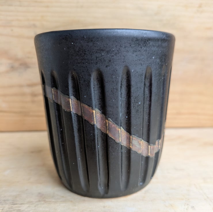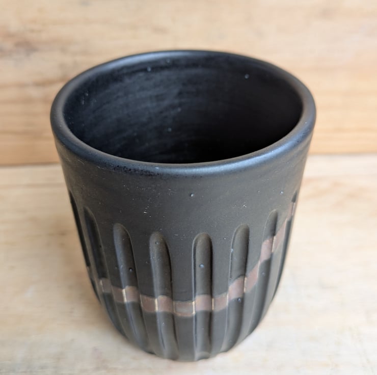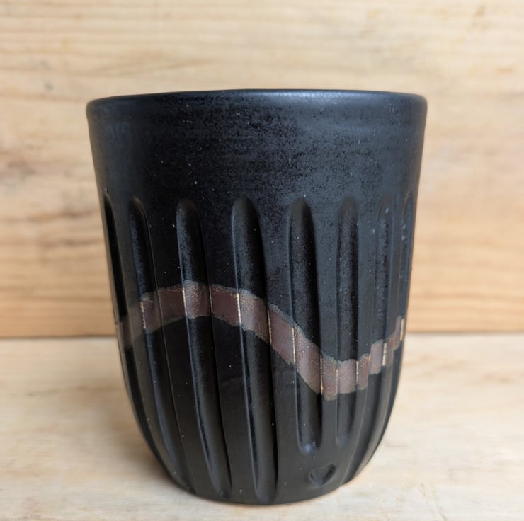 I've used a smooth white clay for this tumbler, with carved sides in a matte black glaze & a copper strip...this is a design that takes quite a bit of time to glaze so there won't be many of them!! One of these has a slightly more rounded base as you can see in the photos. Fired to c1200 degrees (stoneware temperature) and this makes the tumbler more durable.