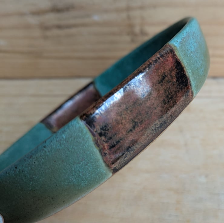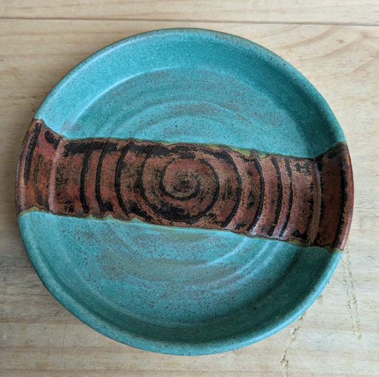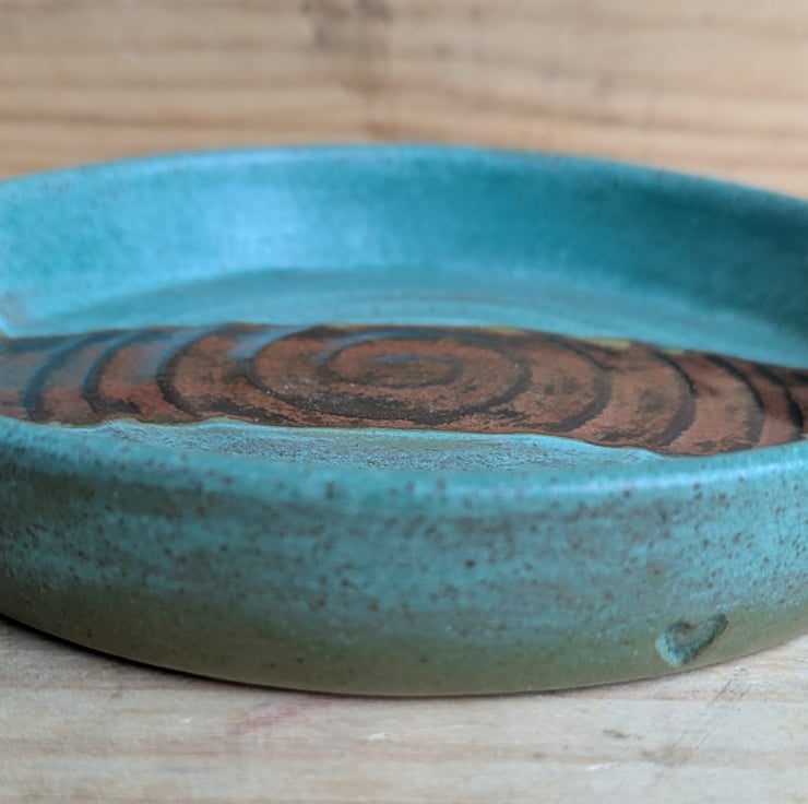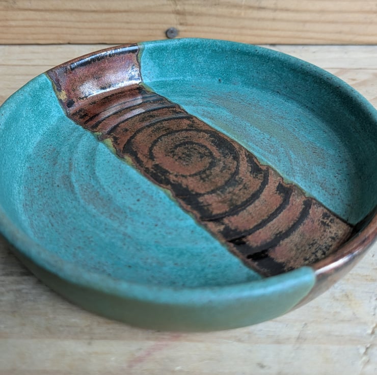 This dish could be used for various things - olives, trinkets, even tea bags! A lovely bright green matte glaze with a copper strip in the centre. Fired to c1200 degrees (stoneware temperature) which makes things more durable than earthenware.