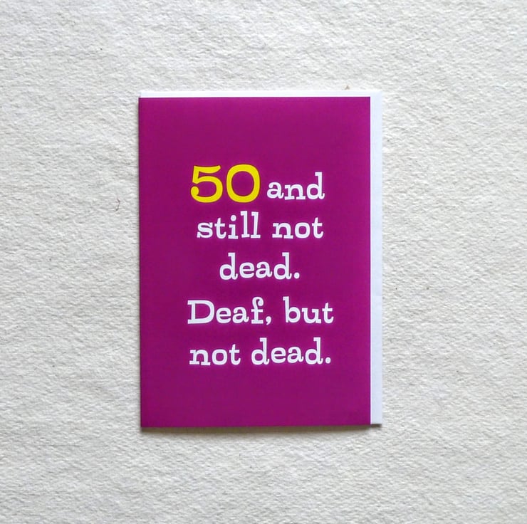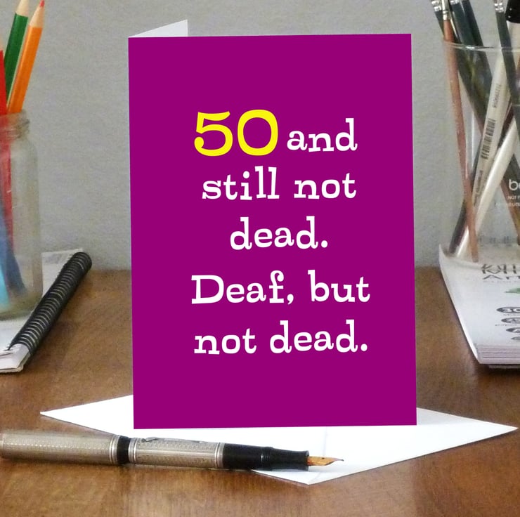 A funny 50th birthday card for someone who is a bit hard of hearing or pretends to be until your offer them a glass of wine!