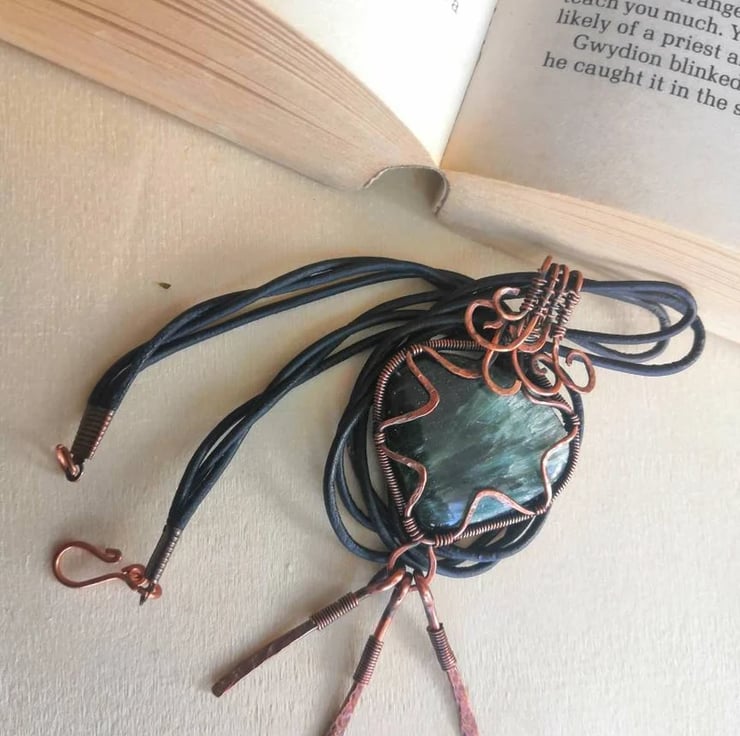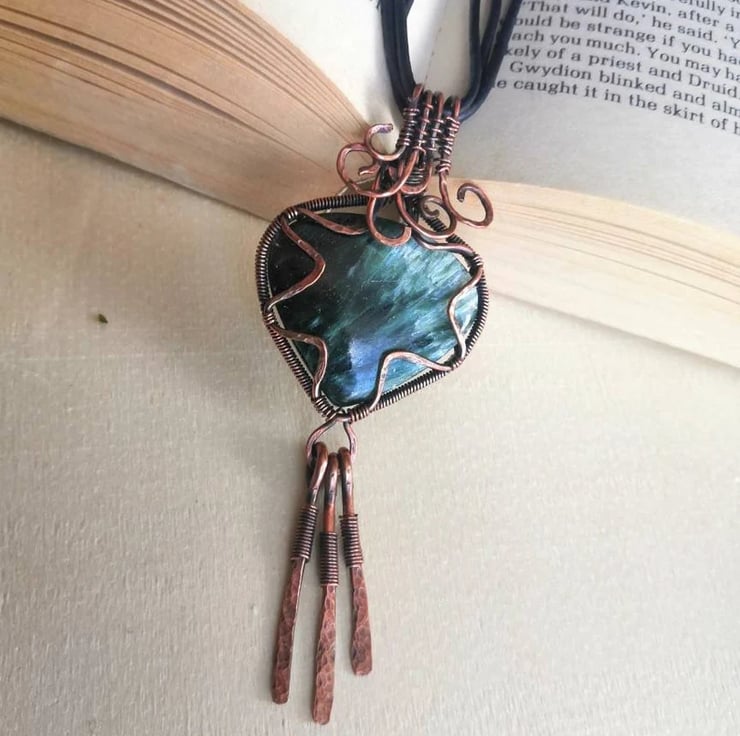 A gorgeous natural seraphinite encased into a solid copper pendant. Handmade using the wirewrapping method and finished with three textured charms at the bottom. The stone is a beautiful deep green colour, with white pearlescent "wings". Hangs on an 18" triple black leather cord necklace.