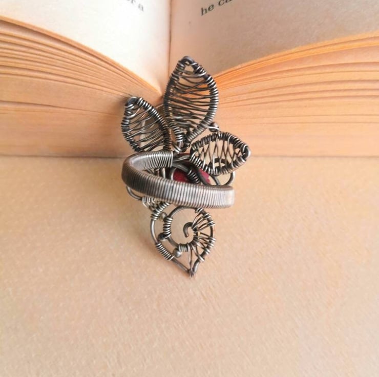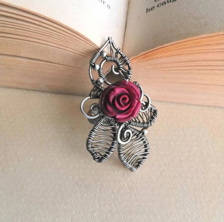 An ornamental wirewrapped ring in a UK size N. Features a resin deep red rose and leaf design. Handmade out of silver-clad copper wire - unlike silver-plated wire, this material is coated with a thick layer of pure silver, making it durable and resistant to the plating wearing off.