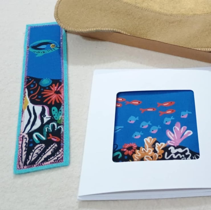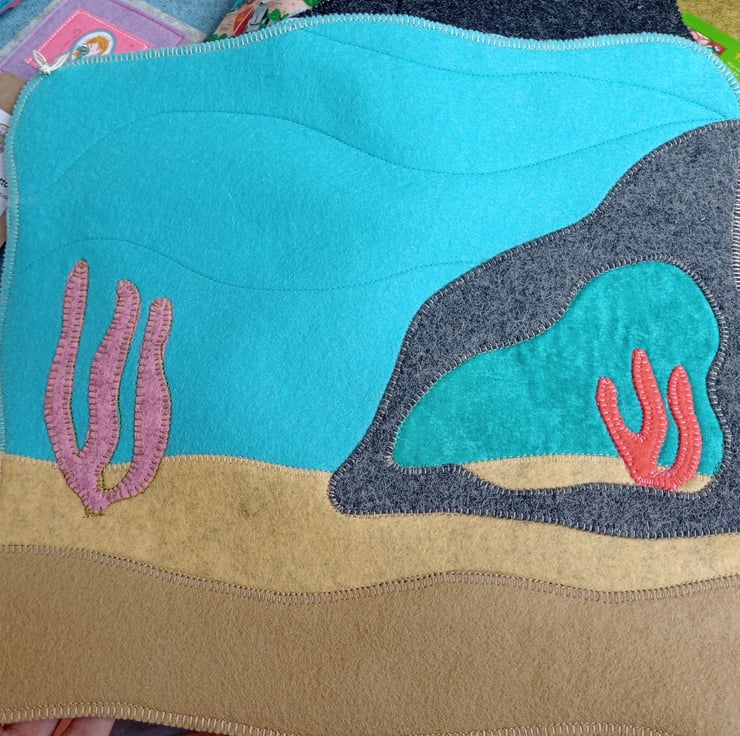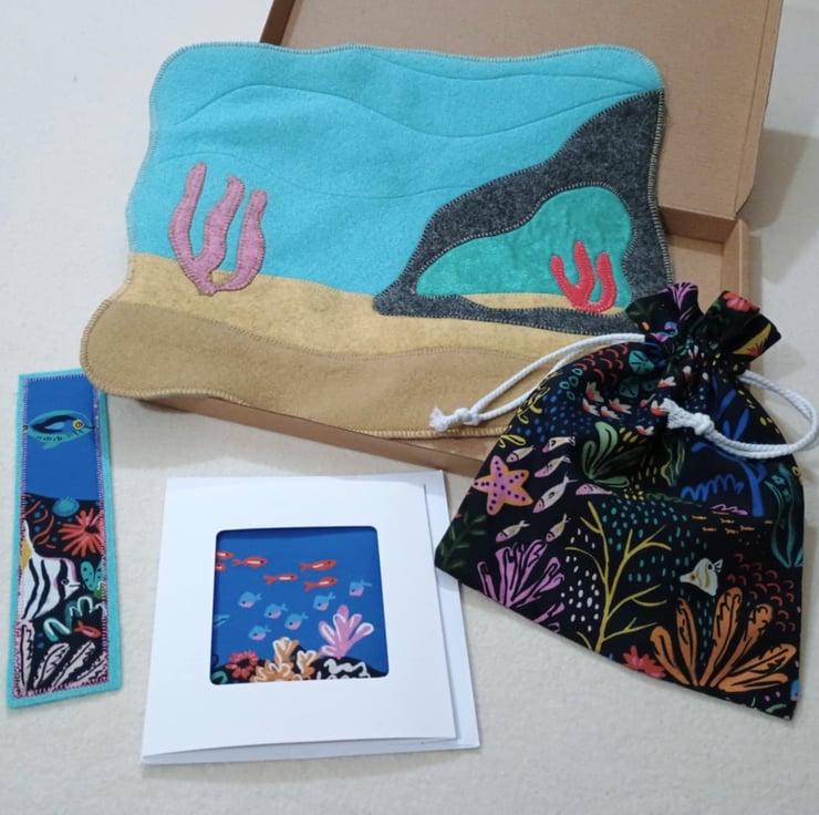 Gift set for child, combining one of my felt play scenes with a drawstring toy storage bag and a bookmark in a choice of themed fabrics. With a stunning under the sea scene on one side, and reversing to ocean islands on the other, this is ideal for use with your child's mermaid, pirate or sea animal small-play toys.