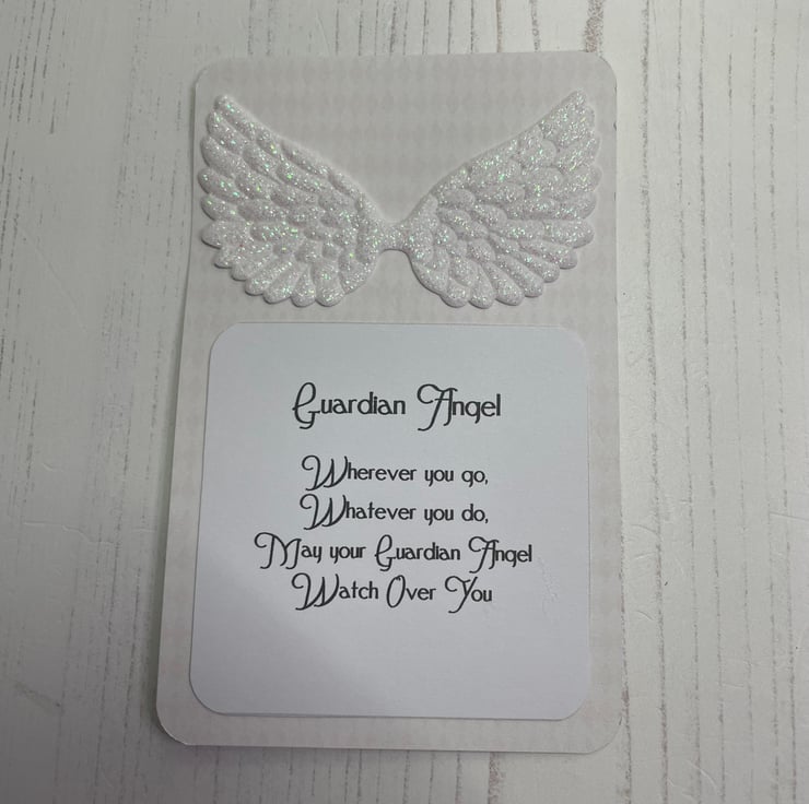 Beautiful angel card, embellished with glitter and diamante's. Glitter angel wings on the back with the wording: