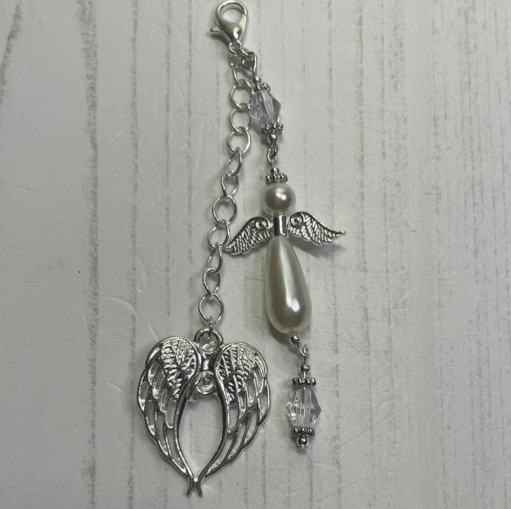 Charm Dangle on a silver tone lobster clasp, chain and angel wings with a heart, Bicone crystal beads with an angel in pearl with silver wings.
