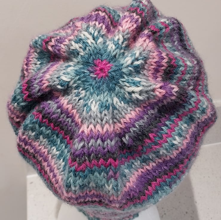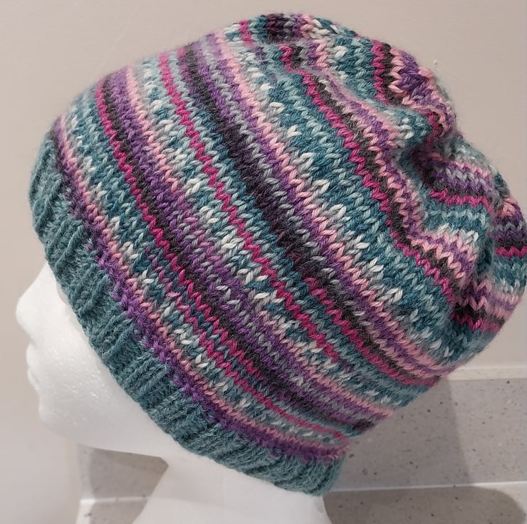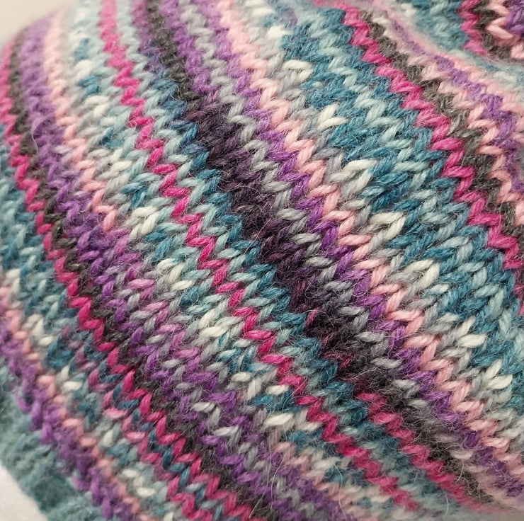 This hat has been hand knitted on the round to show off the self striping jacquard pattern brilliantly.