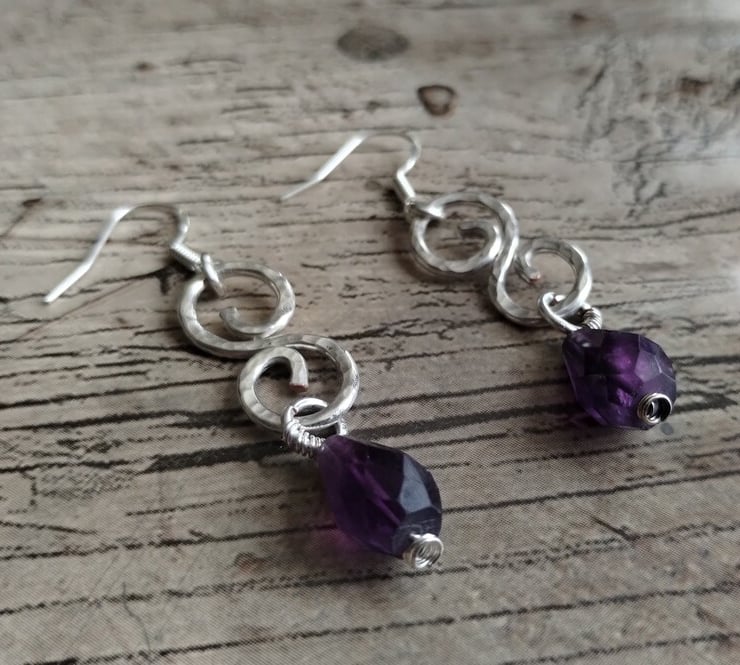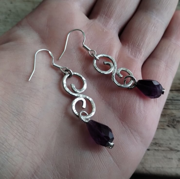 Hand-crafted drop earrings in silver finish, featuring dark faceted amethyst stones and non-allergenic sterling silver ear hooks. These are woven out of silver-clad copper wire which, unlike silver-plated wires, is coated with a thick layer of pure silver and is therefore more durable and resistant to the plating wearing off.