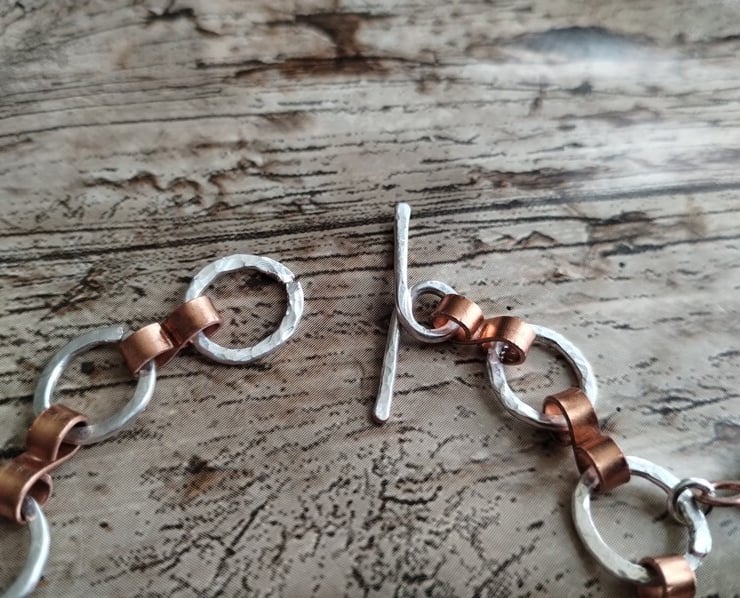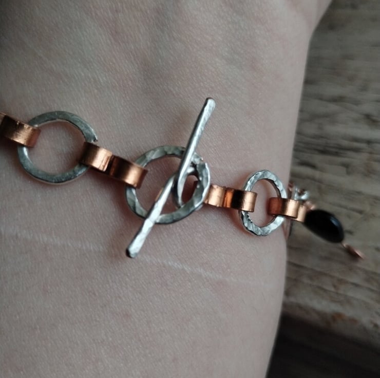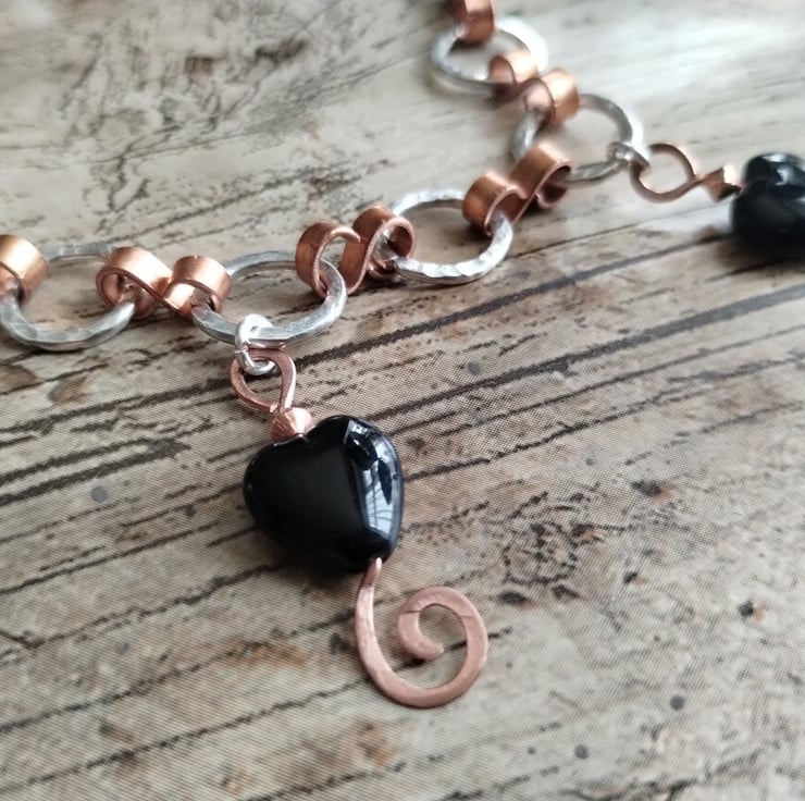 Hand crafted chain bracelet with black glass heart charms in silver and copper duo tone. Each chain link has been shaped, hammered and polished by hand. Toggle / T-bar closure. 21cm in length.