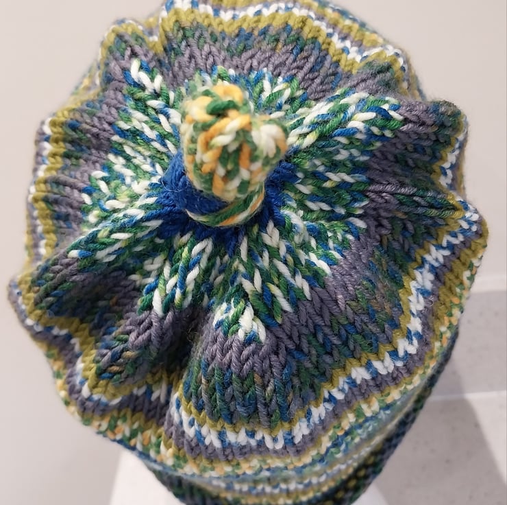 This hat has been hand knitted on the round to show off the self striping jacquard pattern brilliantly. It is a simple roll up design so will sit on or below the ears depending on how you want to wear it. It has a fun knotted top making it a little quirky.