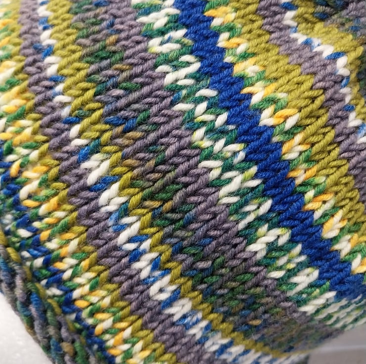 This colourwave is a Forest mix of Olive, Green, Blue, a Purple Brown and a smattering of Yellow with a White Fairisle effect.