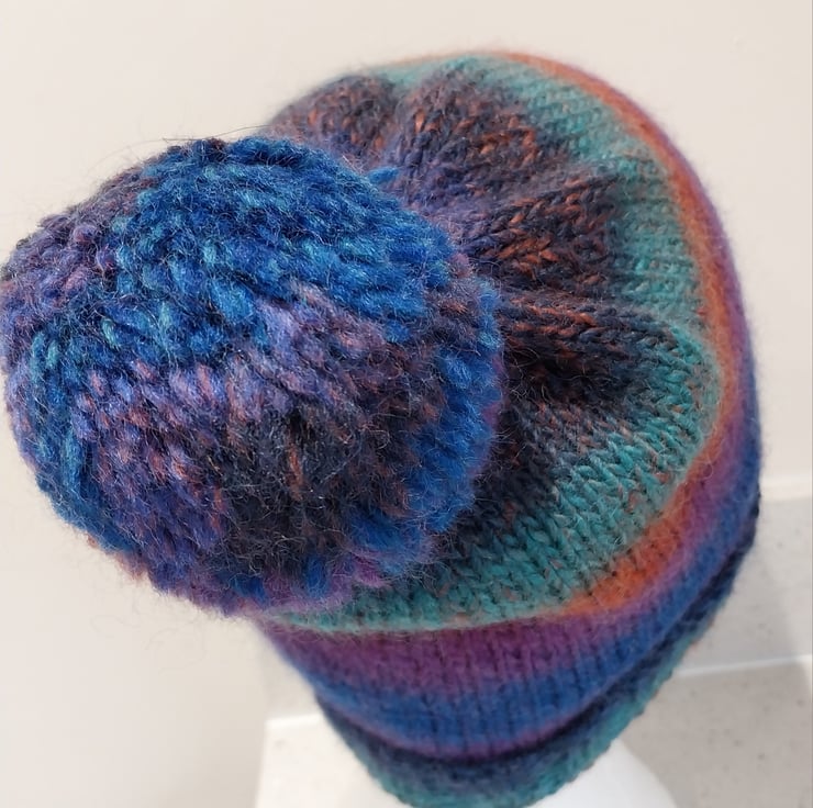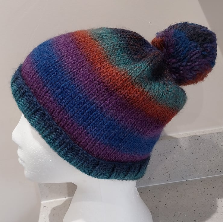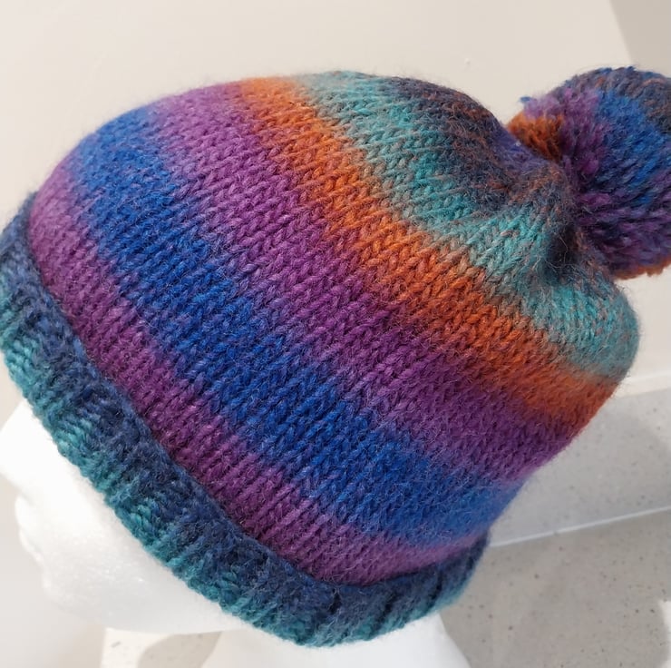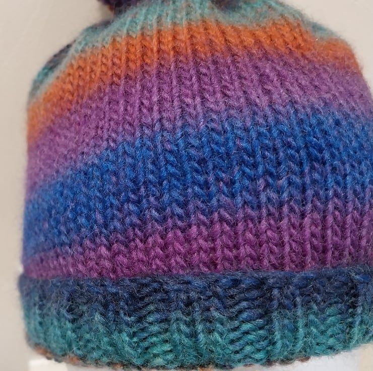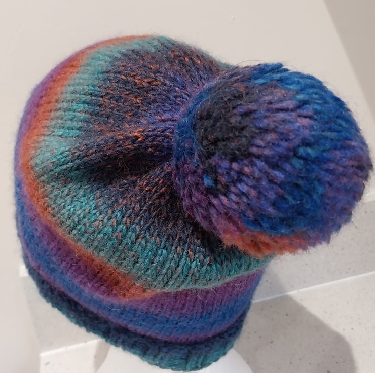 One of 2 bobble hats I have knitted from a soft, self-striping pure wool.