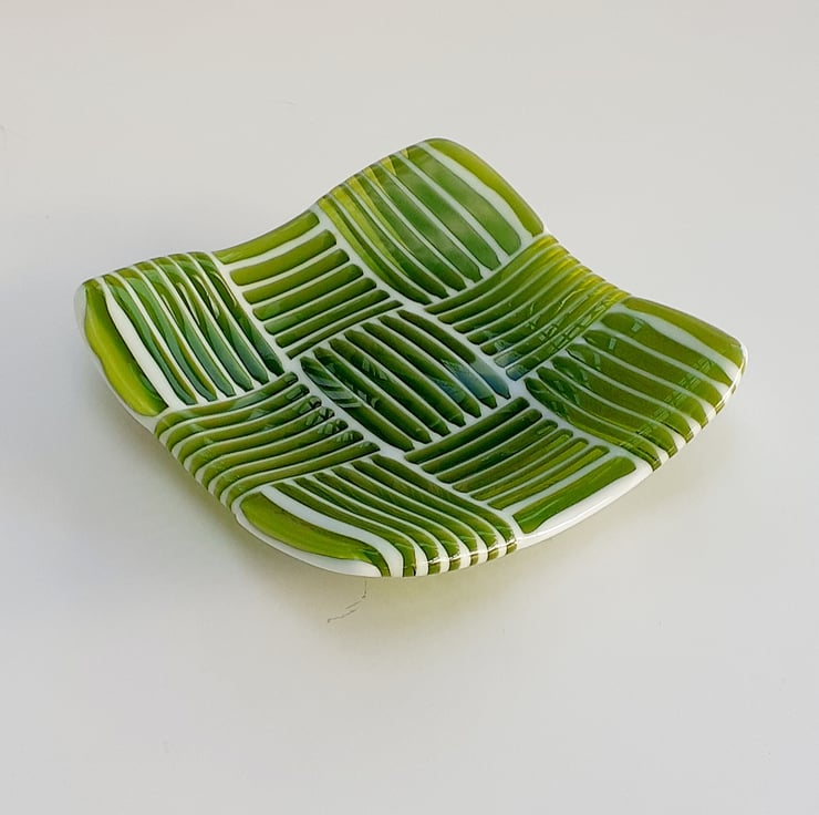 The strips are cut from opaque white and transparent lime green art glass, which are laid on edge and fitted tightly together. It has a substantial chunky feel, due to the on-edge construction, and a semi-transparent appearance. The dish measures 14cm square with a gentle curved shape and a maximum height if 3cm. Looks great as a display item on a white shelf or table.