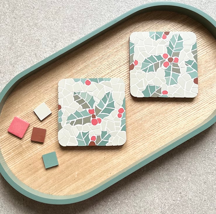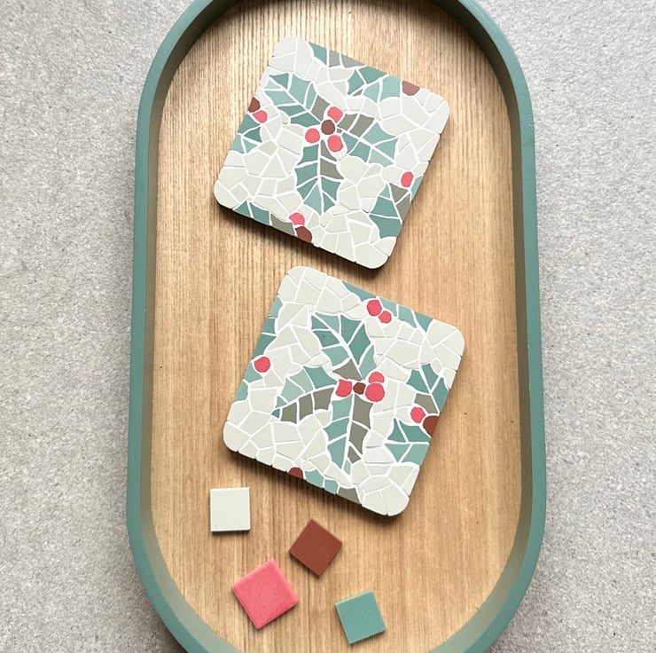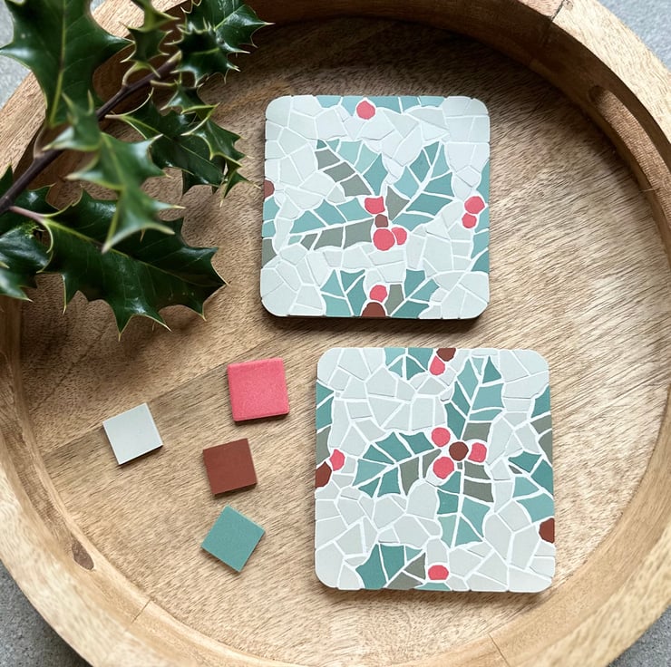 Two elegant, unique mosaic coasters that feature Holly on a silver grey background. The leaves are created in shades of green and the berries are cut from brick red tiles and a lovely bright Ruby tile from Emaux de Briare.