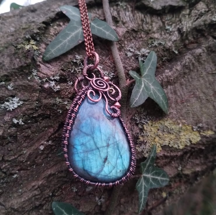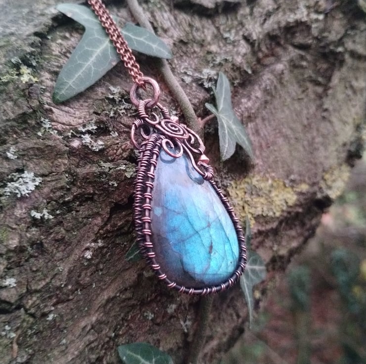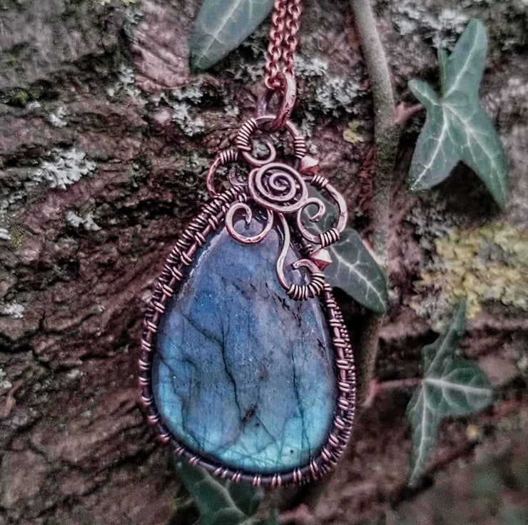 A large, fiery blue labradorite wire wrapped in pure copper to create this striking pendant. The copper has been aged, hand-polished and finished with jeweller's wax to prevent discolouration. The pendant hangs on an 18" copper tone chain necklace.