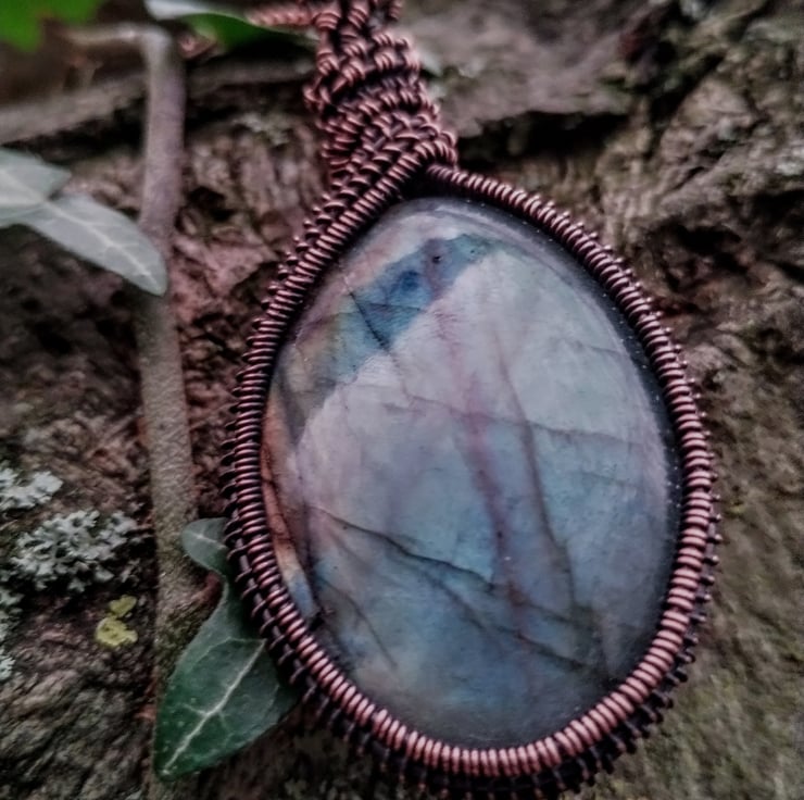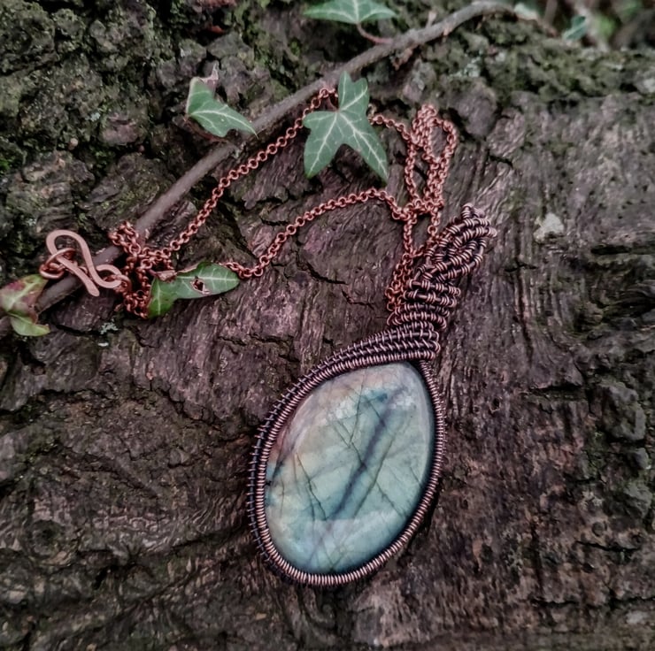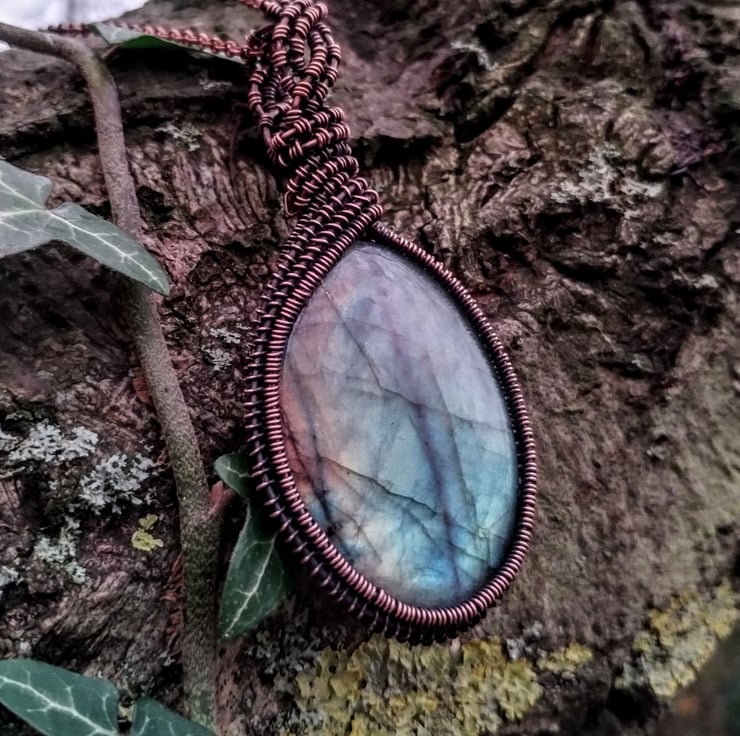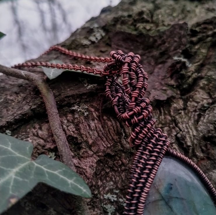 A large, rainbow labradorite encased in a hand-woven, wire-wrapped pure copper pendant in a Viking-inspired braid design. The metal has been aged, polished by hand and finished with jeweller's wax to prevent discolouration. The pendant hangs on an 18" copper tone chain necklace.