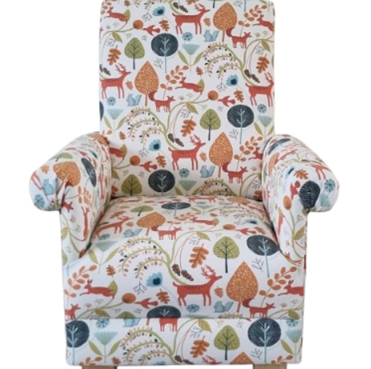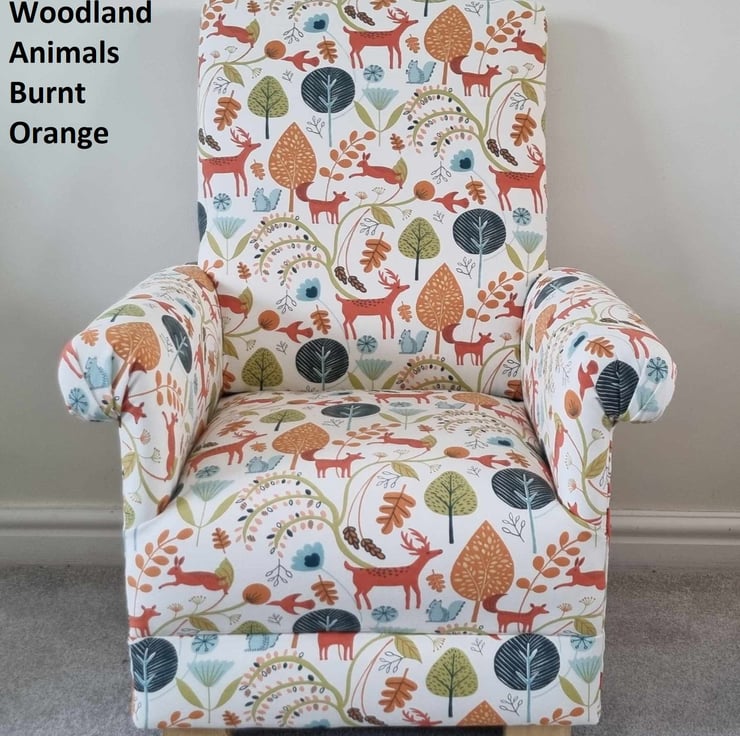 I am a professional upholsterer with over 33 years experience, and have made this sturdy little CHILD’S chair, using this Fryetts Woodland Animals in Burnt Orange fabric..