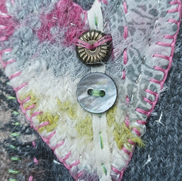 Hand stitched heart brooch made from Swatch silk tartan and sewing scraps. Lovingly hand stitch to add texture and detail. It comes with its own hand stitched pouch to protect it.