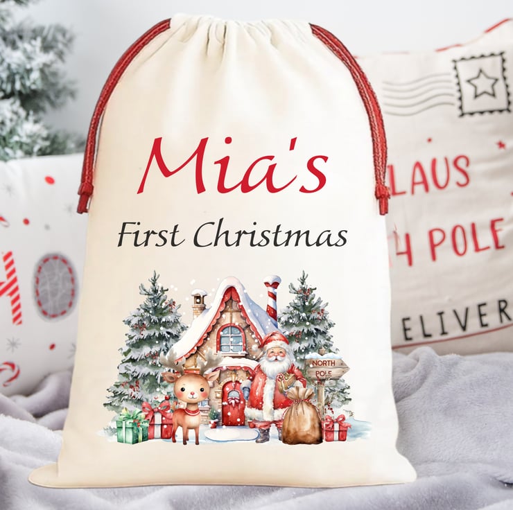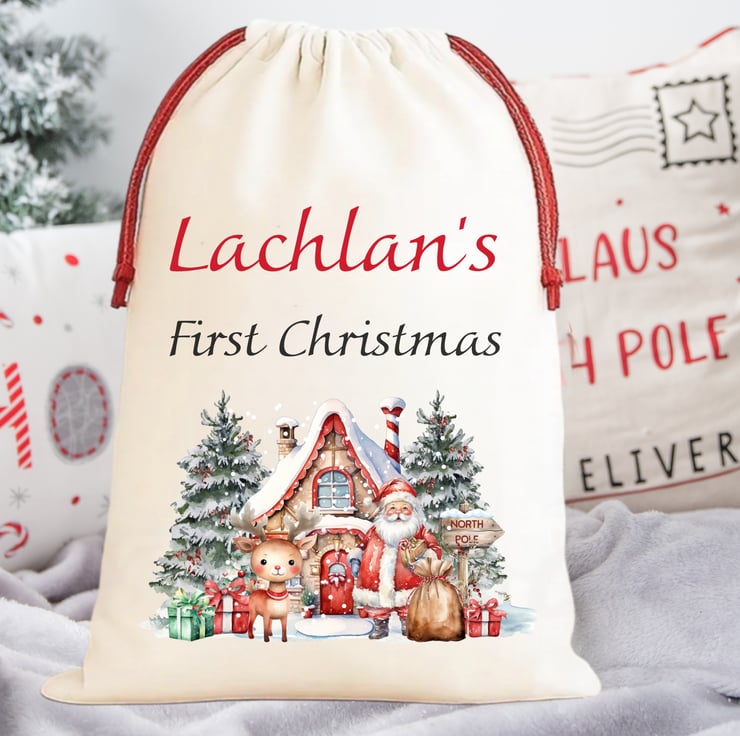 Make your child's First Christmas extra special with this lovely personalised Santa sack, featuring Father Christmas & Rudojph outside Santa's workshop! Customised with your child's name, this linen effect bag makes a treasured keepsake.