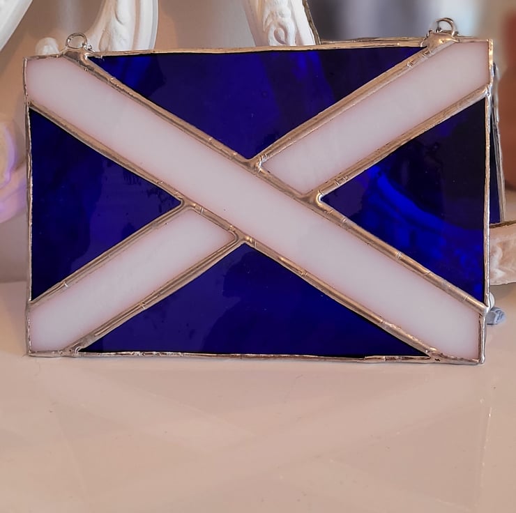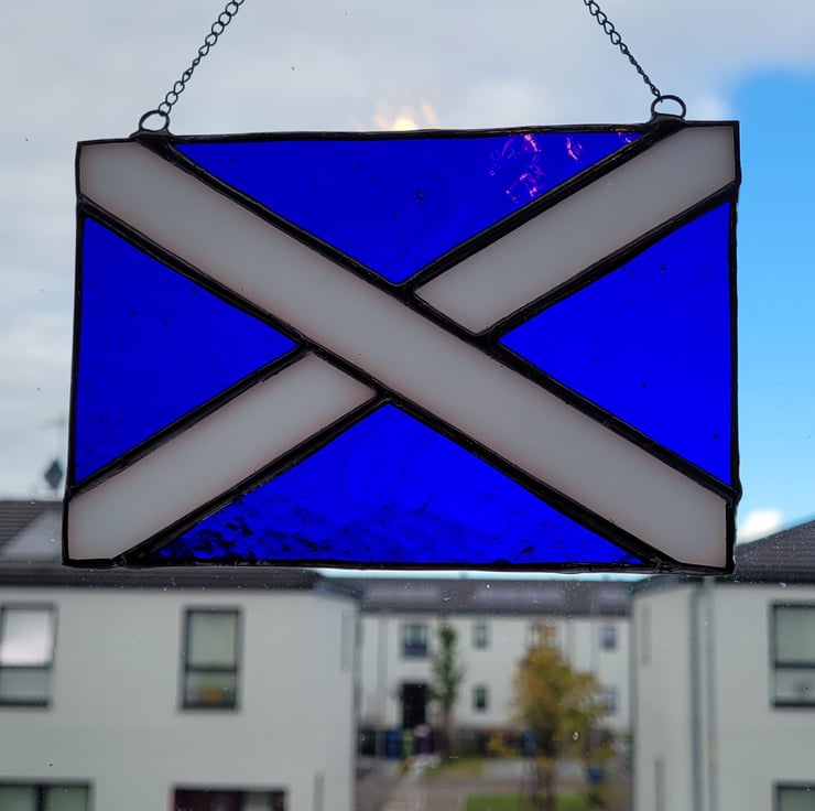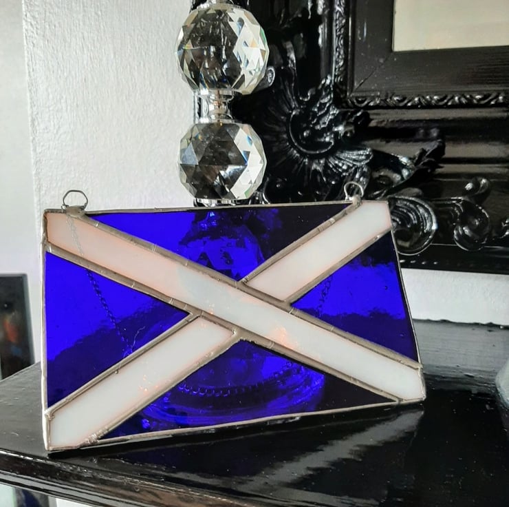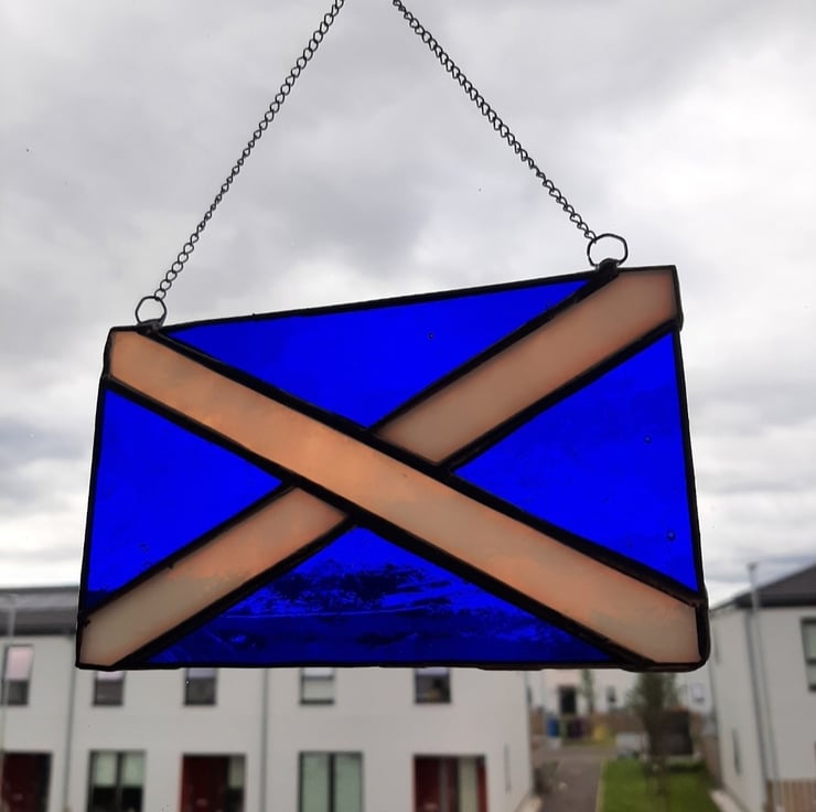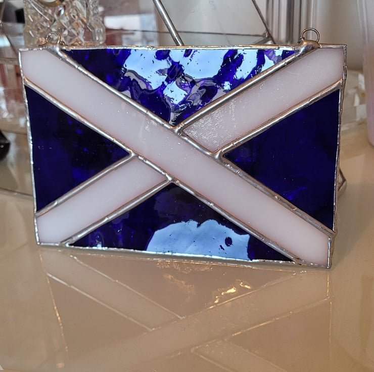 Stained glass Scottish saltire made with colourful glass using copperfoil method.