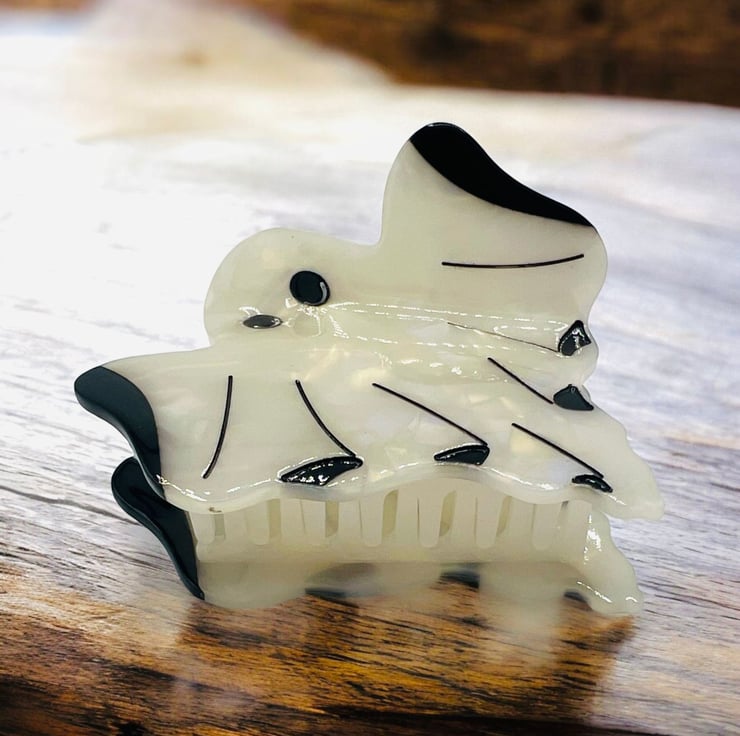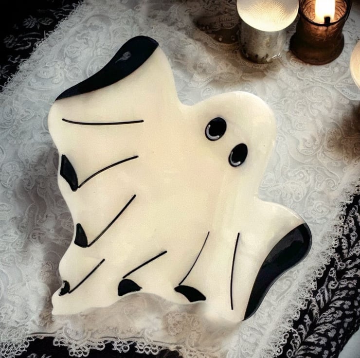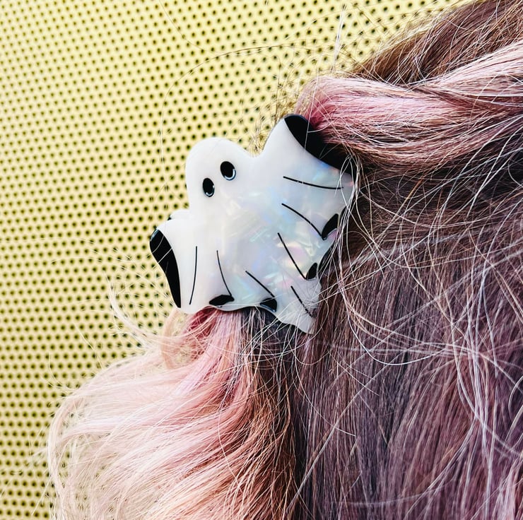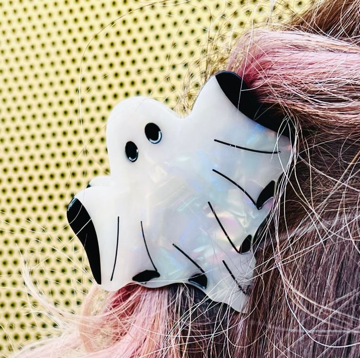 Perfect for spooky season and beyond. This iridescent ghost hair clip will shimmer in the light and add a bit of joy to any occasion.