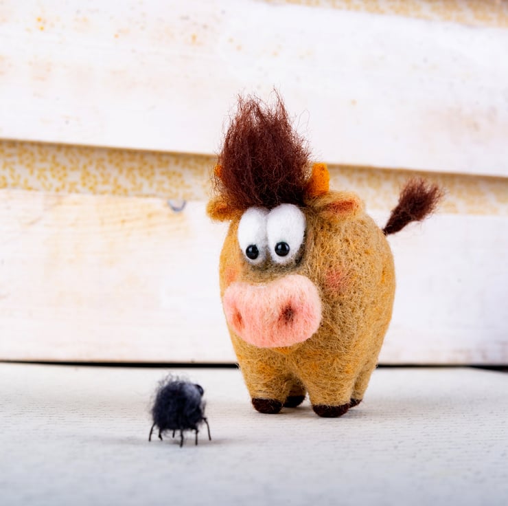 Bruno the Bull and his friend Spider” is a story about how even the biggest differences can lead to friendship. At first, Bruno was a little scared of the little spider, and the spider, in turn, was scared of Bruno. But curiosity won out, and they became friends, becoming best friends! This handmade toy is made of natural wool using the dry felting technique. The bull has a funny look with an interesting hairstyle and friendly eyes, and the spider is small and cute, only 1 cm tall. Together they form a unique duet. Size: Bull – 8 cm, Spider – 1 cm. This pair will be a great gift for any holiday, home decor or just a cute companion for the soul. Made with love and care!