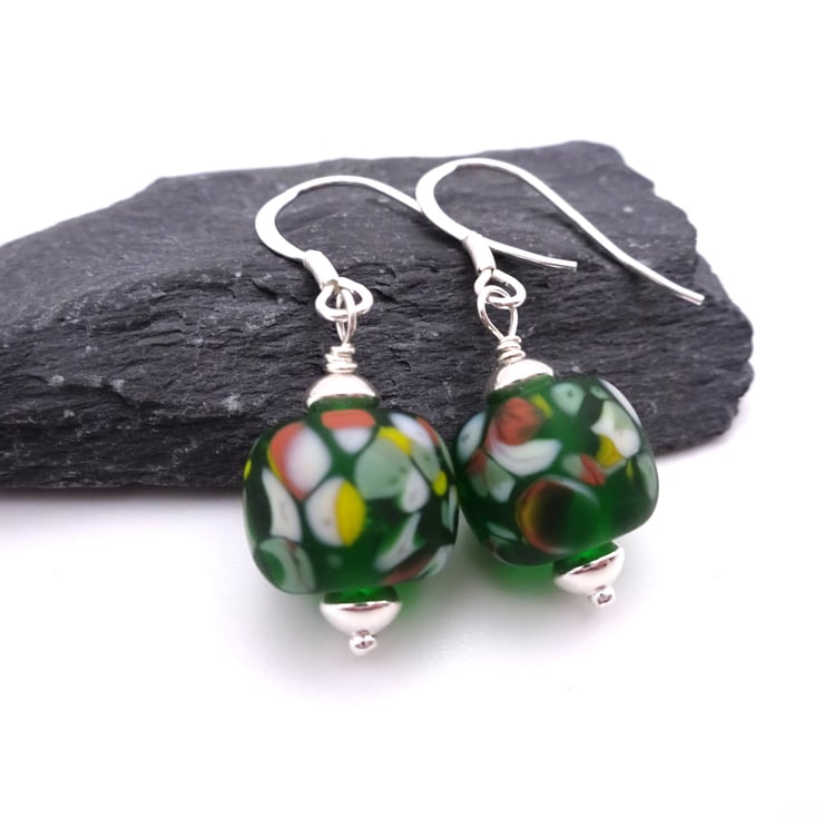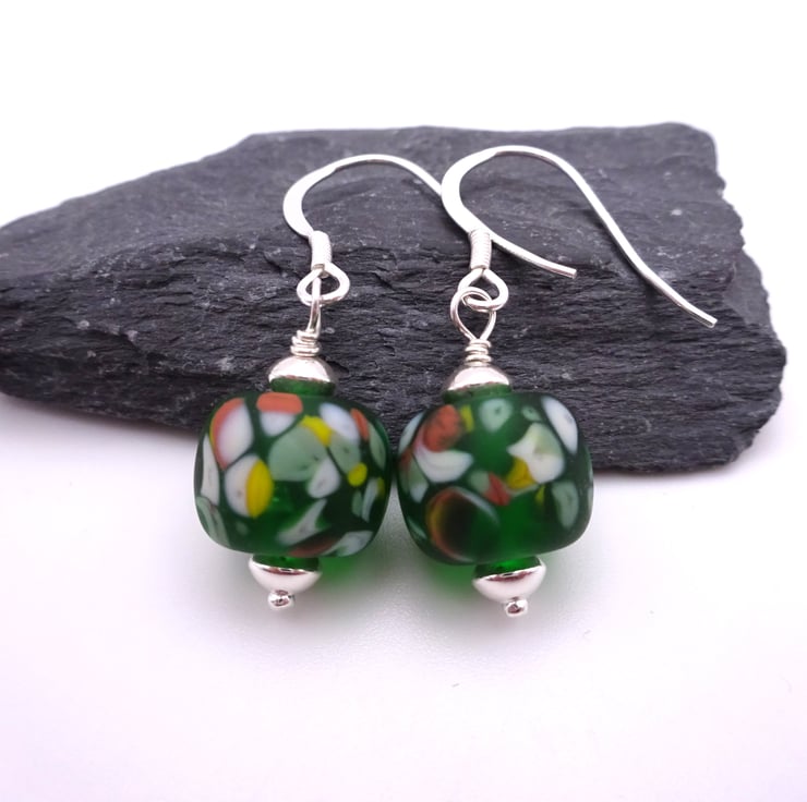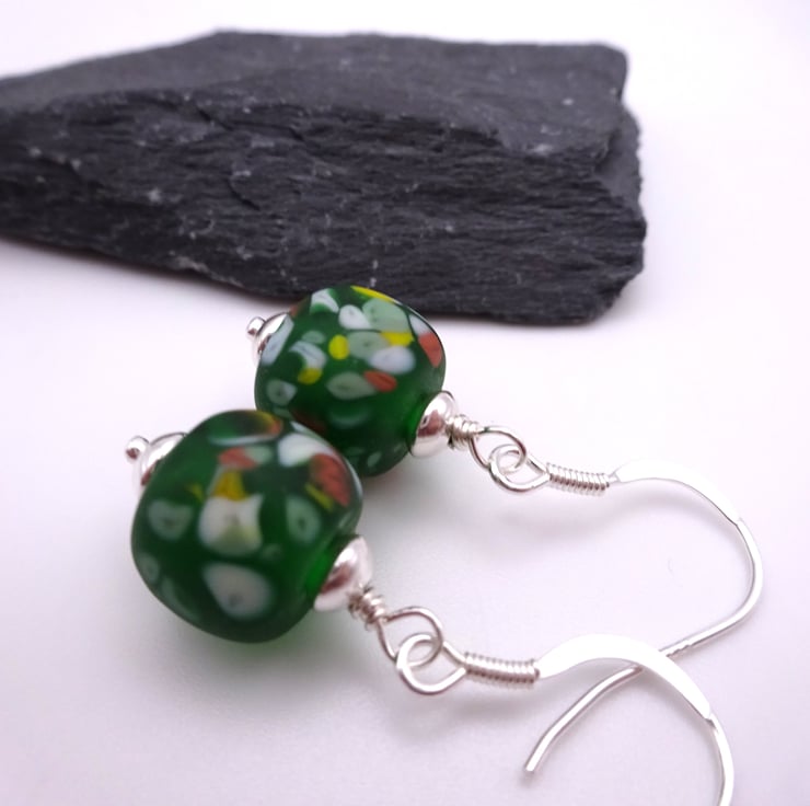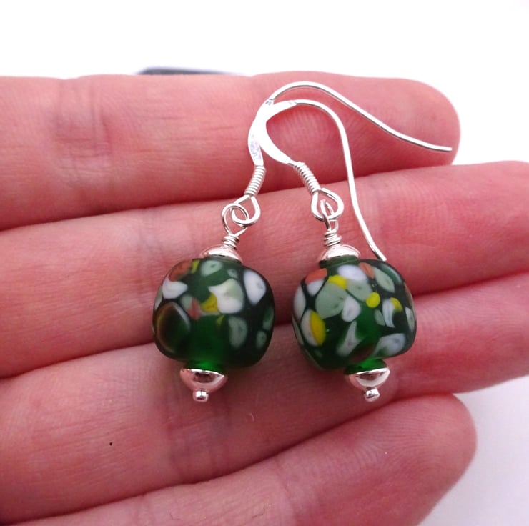 A pair of earrings made with sterling silver ear wires and handmade lampwork glass dark green beads.